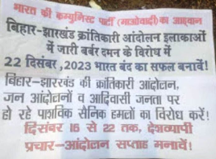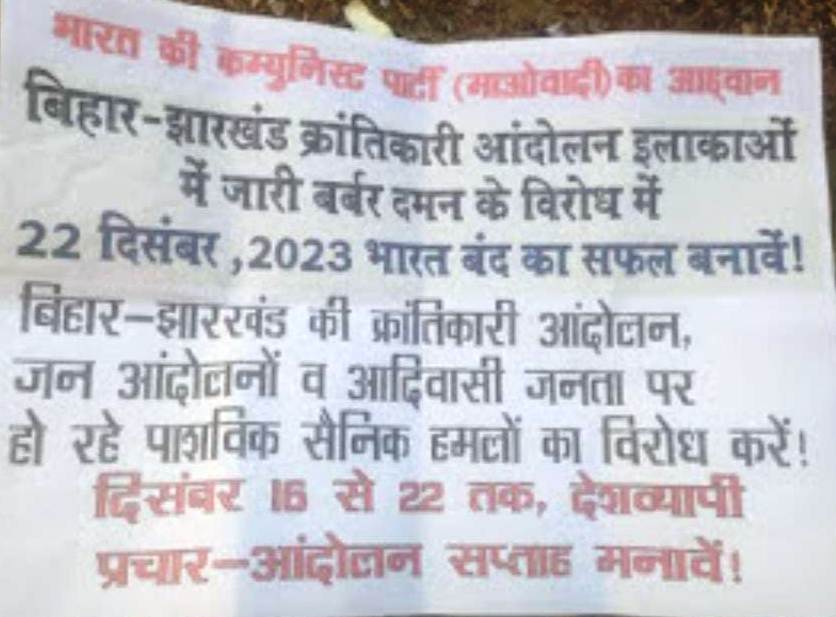 जगदलपुर – बीजापुर नेशनल हाईवे 63 पर कर्रेमरका व मद्देड़ के आसपास नक्सलियों ने एक दिन पहले ही पर्चे फेंककर और बैनर पोस्टर लगा रखे थे। इन पर्चे और बैनर पोस्टर्स में भारत बंद का आव्हान किया गया है। ऐसे ही एक पर्चे में लिखा है कि बिहार, झारखंड के क्रांतिकारी आंदोलन वाले इलाकों में जारी बर्बर दमन के विरोध में भारत की कम्युनिस्ट पार्टी माओवादी के 22 दिसंबर के भारत बंद के आह्वान को सफल बनाएं। क्रांतिकारी जन आंदोलनों व आदिवासी जनता पर हो रहे सैन्य हमलों का विरोध करें और 15 से 22दिसंबर तक चलने वाले प्रचार आंदोलन सप्ताह को सफल बनाएं।