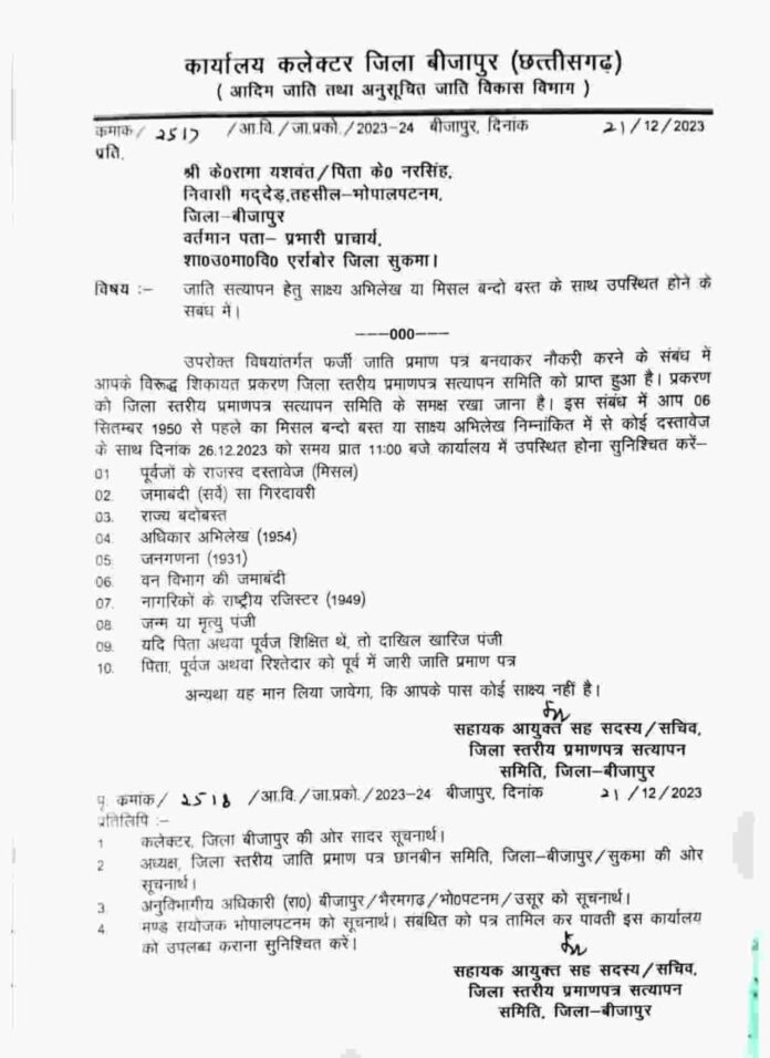के. रामा यशवंत पर फर्जी जाति प्रमाण पत्र के सहारे नौकरी हासिल करने का आरोप है। शिकायत के आधार पर के. रामा यशवंत को अपनी जाति प्रमाणित करने के लिए जाति प्रमाण पत्र छानबीन समिति के समक्ष पेश होने कई दफे नोटिस भेजे जा चुके हैं, लेकिन हर बार वे कोई न कोई बहाना बनाकर समिति के समक्ष पेश नहीं होते। पिछली बार समिति ने उन्हें नोटिस जारी कर 26 दिसंबर को वंशावली, मिसल रिकॉर्ड, कोटवार दस्तावेज व अन्य प्रमाणों के साथ बुलाया था। तब के. रामा यशवंत मेडिकल आधार पर पेश नहीं हुए। इस बीच एक नया खुलासा हुआ है कि प्रभारी प्राचार्य के. रामा यशवंत एर्राबोर के अपने स्कूल में नियमित रूप से उपस्थित हो रहे हैं। इससे जाहिर होता है कि एक फर्जीवाड़ा को छुपाने के लिए उन्होंने दूसरा फर्जीवाड़ा किया है। मेडिकल बेस पर वे छानबीन समिति के समक्ष तो पेश नहीं हो रहे हैं, लेकिन स्कूल बराबर पहुंच रहे हैं। यानि वे बिल्कुल भी अस्वस्थ नहीं हैं और उन्होंने फर्जी मेडिकल सर्टिफिकेट पेश किया है। सुकमा जिले की शासकीय उच्चतर माध्यमिक शाला एर्राबोर में पदस्थ प्रभारी प्राचार्य के. रामा यशवंत पिता के. नरसिंह बीजापुर जिले की भोपालपटनम तहसील के ग्राम मद्देड़ के निवासी हैं। उनके जाति प्रमाण पत्र मामले की जांच लंबे समय से चल रही है। उनके खिलाफ फर्जी जाति प्रमाण पत्र के जरिए नौकरी हासिल करने की शिकायत शासन से की गई है। पिछले सात माह से उन्हें नोटिस पर नोटिस भेजकर जिला स्तरीय जाति प्रमाण पत्र छानबीन समिति बीजापुर के समक्ष पेश होने और जाति से संबंधित आवश्यक प्रमाण रखने के लिए कहा जा रहा है। के. रामा यशवंत शुरू से ही तरह तरह के बहाने बनाकर समिति के समक्ष उपस्थित होने से बच रहे हैं। वे कभी मेडिकल आधार पर, तो पारिवारिक समस्या का हवाला देकर समिति के सामने उपस्थित होने से बचते आ रहे हैं। 26 दिसंबर 2023 को भी उन्हें उपस्थित होने के लिए नोटिस भेजा गया था, किंतु उस दिन भी पेश नहीं हुए। पता चला है कि उन्होंने मेडिकल लेकर 15 दिन का समय मांगा है। जबकि सूत्र बताते हैं कि के. रामा यशवंत शीतकालीन अवकाश के बाद 1 जनवरी 2024 से लगातार एर्राबोर स्कूल में सेवा देने पहुंच रहे हैं। स्कूल में सेवा देने के लिए पूरी तरह से फिट के. रामा यशवंत को समिति के सामने पेश होने के नाम पर ही आश्चर्यजनक ढंग से बुखार कैसे चढ़ जाता है, यह जांच का विषय है। कहा जा रहा है कि के. रामा यशवंत जाति के फर्जीवाड़े को छुपाने के लिए फर्जी मेडिकल सर्टिफिकेट का भी सहारा लेने लगे हैं। ज्ञात हो कि फर्जी जाति प्रमाण पत्र मामले 7 कर्मचारियों को शासन द्वारा सेवामुक्त कर दिया गया है। वहीं के. रामा यशवंत अनुसूचित जनजाति आयोग व अन्य कारणों का हवाला देकर जांच कमेटी के पास जाने से बचते आ रहे हैं। वे छानबीन समिति 