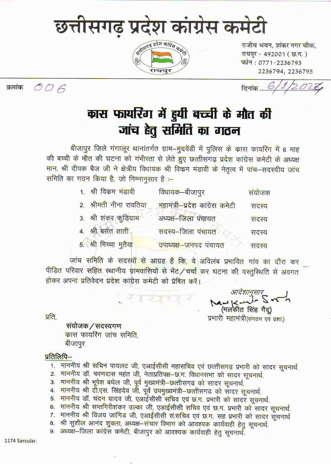 जगदलपुर बस्तर संभाग के बीजापुर जिले में पिछले दिनों पुलिस और नक्सालियों के बीच चली मुठभेड़ के दौरान एक बच्ची की मौत हो जाने तथा उसकी मां के घायल होने की घटना की जांच के लिए कांग्रेस ने एक कमेटी का गठन किया है। बीजापुर के गंगालूर थाना अंतर्गत मुदवेंडी गांव की एक बच्ची की मुठभेड़ के दौरान क्रॉस फायरिंग में गोली लगने से मृत्यु हो गई थी। बच्ची की मां के हाथ में भी गोली लगी थी। प्रदेश कांग्रेस अध्यक्ष दीपक बैज ने इस घटना को गंभीरता से लिया है। कांग्रेस के प्रदेश महामंत्री प्रभारी संगठन एवं प्रशासन मलकीत सिंह गैदू ने बताया कि पीसीसी चीफ दीपक बैज ने मामले की जांच के लिए एक कमेटी बनाई है। कमेटी के संयोजक बीजापुर के विधायक विक्रम मंडावी, सदस्य प्रदेश कांग्रेस की महामंत्री नीना रावतिया, जिला पंचायत सदस्यद्वय शंकर कुड़ियाम व बसंत ताती तथा जनपद उपाध्यक्ष मिच्चा मुतैया को बनाया गया है। गैदू के मुताबिक समिति को जल्द मौके पर जाकर सच्चाई का पता लगाने व रिपोर्ट प्रदेश कांग्रेस कार्यालय को जल्द भेजने के लिए कहा गया है।