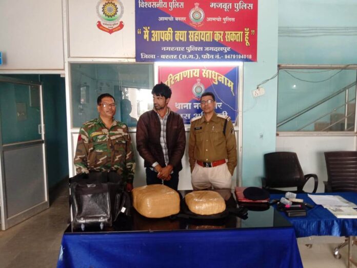 पकड़े गए आरोपी का नाम 30 वर्षीय देवकरण कुमार पिता लखीराम जाट निवासी ग्राम ददरेवा, थाना राजगढ़ जिला चुरु राजस्थान बताया गया है। 6 जनवरी को पुलिस को सूचना मिली कि एक व्यक्ति नरेश ट्रेवल्स की यात्री बस सीजी 07 ई 7720 से बैग में गांजा लेकर ओड़िशा से जगदलपुर की ओर आ रहा है। सूचना के आधार पर फॉरेस्ट नाका धनपूंजी में नाकाबंदी कर आरोपी देवकरण कुमार को पकड़ लिया गया। तलाशी लेने पर आरोपी के कब्जे से कुल 15.310 किलोग्राम गांजा कीमती 1लाख 53हजार 100 रुपए एवं नकद 1हजार रुपए एक नग मोबाइल फोन बरामद हुए। आरोपी को धारा 20 (ख) एनडीपीएस एक्ट के तहत गिरफ्तार कर उसे जगदलपुर न्यायालय में पेश किया गया। आरोपी को पकड़ने में निरीक्षक शिवानंद सिंह, सहायक उप निरीक्षक रेनूराम मौर्य, आरक्षक चेतन बघेल, राधाकृष्ण राय, डीएसएफ आरक्षक जोगेश्वर कश्यप व सैनिक सत्यनारायण का योगदान रहा।