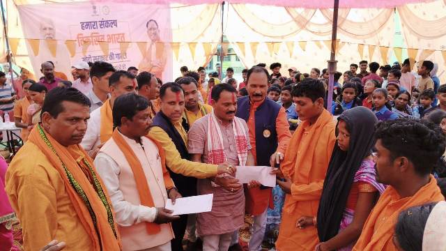 लकड़ी, उपले के धुंए के बीच अपनी आंखों और फेफड़ों के नुकसान की कीमत पर भोजन तैयार करने वाली महिलाओं को उज्जवला योजना के तहत रसोई गैस कनेक्शन दिए जा रहे हैं। किसानों को जमीन की उर्वरा शक्ति बढ़ाने के टिप्स के साथ उन्नत बीज और खाद के किट्स दिए जा रहे हैं। बेरोजगार युवाओं और गृहस्थ महिलाओं को स्वावलंबी बनाने अल्पतम ब्याज दर पर ऋण एवं उन्नत नस्ल की बकरी, मुर्गी आदि दी जा रही है। ऐसी और भी कई योजनाएं हैं, जिनका लाभ लेकर ग्रामीण विकसित एवं सशक्त भारत के निर्माण में सहभागी बन रहे हैं। विकसित भारत संकल्प यात्रा सिर्फ प्रधानमंत्री आवास योजना के तहत घर बनाकर देने का ही उपक्रम नहीं कर रही है, बल्कि घर बसाने का काम भी कर रही है। इसकी बड़ी अच्छी बानगी बकावंड विकासखंड के ग्राम टलनार में देखने को मिली। संकल्प यात्रा कार्यक्रम के पंडाल तले पांच परिवारों के युवक – युवतियों का परिणय बंधन संस्कार भी संपन्न हुआ। विकसित भारत संकल्प यात्रा का यह अंतिम पड़ाव था। परिणय सूत्र में बंधे पांचों जोड़ों को उपस्थित भाजपा नेताओं पंचायत प्रतिनिधियों और ग्रामीणों ने उन पर पुष्प वर्षा कर शुभकामनाएं दी। ब्लॉक के भाजपा नेताओं की इस अनूठी पहल की चारों ओर प्रशंसा हो रही है। पांच जोड़ों के आदर्श विवाह कार्यक्रम के मुख्य अतिथि जिला पंचायत उपाध्यक्ष मनीराम कश्यप व अतिथि प्रदेश भाजपा के कार्यकारिणी सदस्य वनवासी मौर्य, वेदप्रकाश पाण्डे, कपिल पांडे, महेश कश्यप, दामूधर बघेल, पुरषोत्तम जोशी, बृजलाल सेठिया, तुलाराम भारती, सरपंच गुप्ती कश्यप, उप सरपंच तेनसिंह सेठिया आदि थे।