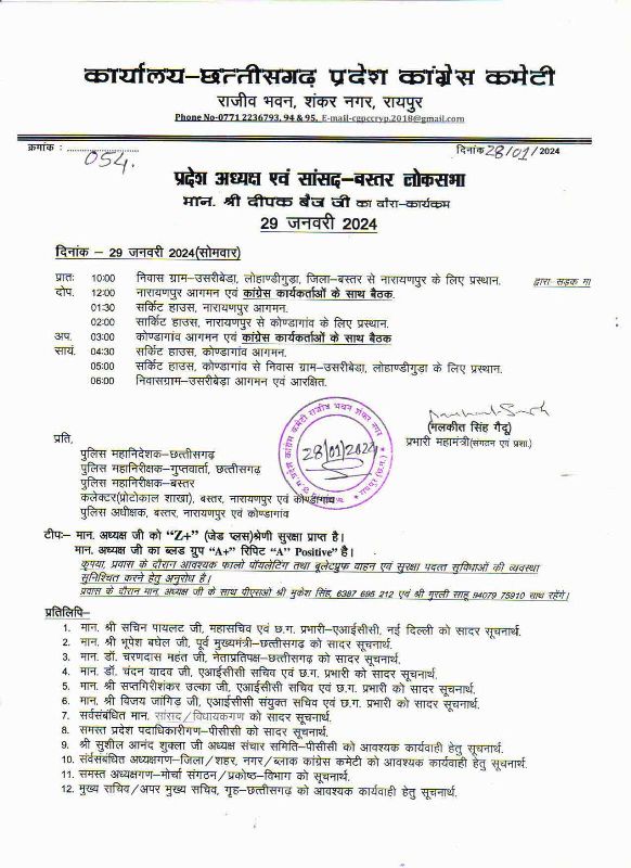लोहंडीगुड़ा प्रदेश कांग्रेस अध्यक्ष दीपक बैज 29 जनवरी को नारायणपुर और कोंडागांव प्रवास पर रहेंगे। बैज 29 जनवरी को सुबह 10 बजे लोहंडीगुड़ा ब्लॉक के ग्राम उसरीबेड़ा स्थित निज निवास से रवाना होकर सड़क मार्ग से 12 बजे नारायणपुर पहुंचेंगे, जहां वे पार्टी कार्यकर्ताओं के साथ बैठक करेंगे। बैठक के बाद वे कुछ देर वहां सर्किट हाउस में रुकेंगे।. पश्चात कोंडागांव के लिए रवाना हो जाएंगे। अपरान्ह 3 बजे कोंडागांव पहुंचकर वे कार्यकर्ताओं की बैठक लेंगे। शाम 4.30 बजे बैज कोंडागांव सर्किट हाउस में कुछ देर विश्राम करने के बाद दीपक बैज शाम 5.30 बजे उसरीबेड़ा वापसी के लिए प्रस्थित होंगे।