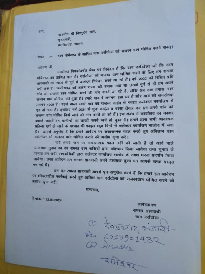 बालोद जिले में स्थित ग्राम दर्राटोला को आज तक राजस्व ग्राम का दर्जा नहीं मिल पाया है। दर्राटोला गांव ग्राम पंचायत धोबेदंड का आश्रित ग्राम है। दर्राटोला को राजस्व ग्राम घोषित करने के लिए ग्रामवासी सन 2000 के पूर्व से आवेदन निवेदन करते आ रहे हैं। वे जहां भी आवेदन देते हैं, वहां से पावती लेकर उसे सुरक्षित रखते आ रहे हैं। छत्तीसगढ़ को अलग राज्य नहीं बनाया गया था उसके पहले से ही दर्राटोला के ग्रामीण अपने गांव को राजस्व ग्राम घोषित करने की मांग करते आ रहे हैं, लेकिन आज तक उनका गांव राजस्व ग्राम घोषित नहीं हो पाया है। हमा गांव में लगभग 150 पर है और गांव की जनसंख्या लगभग 1000 है। पहले वाला हमारे गांव का राजस्व फाईव से नक्शा कलेक्टर कार्यालय से गुम हो गया है। इसलिए वर्ष 2021 से पुनः फाईल व नक्शा तैयार कर हम अपने गांव को राजस्व गांव घोषित किये जाने की मांग करते आ रहे हैं। इस संबंध में कार्यालय का चक्कर काटते काटते हम ग्रामीणों का लाखों रूपये खर्च हो चुका है। हमारे द्वारा सभी आवश्यक प्रक्रिया पूर्ण हो जाने के पश्चात भी फाइल बहुत दिनों से कलेक्टर कार्यालय बालोद में जमा है। आपसे अनुरोध है कि हमारे आवेदन पर सकारात्मक पहल करते हुए अविलम्ब ग्राम दर्राटोला को राजस्व गांव घोषित कराने की असीम कृपा करें।