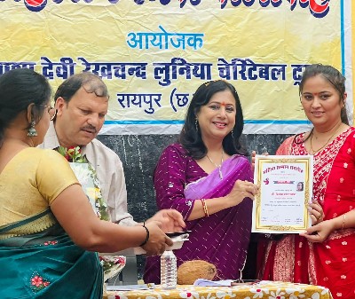सरस्वती शिशु मंदिर टिकरापारा रायपुर में आशा देवी रेखचंद लुनिया चेरिटेबल ट्रस्ट द्वारा समाज के अलग अलग क्षेत्रों में उल्लेखनीय योगदान देने वाली महिलाओं को उत्कृष्ट महिला सम्मान प्रदान किया गया। कार्यक्रम में मुख्य अतिथि गोपा सान्याल पत्रकार एवं गायिका शास्रीय एवं लोक संगीत, विशेष अतिथि छतीसगढ़ डिफेंस अकादमी के रूपेंद्र साहू थे। अध्यक्षता डीपी गोस्वामी संचालक सैनिक मिलिट्री रिम्स ने की। कार्यक्रम प्रभारी पीयूष जैन विशेष रूप से उपस्थित थे। महिला सम्मान समारोह में आकांक्षा तिवारी को पशु सेवा, हरिता पटेल को महिला सशक्तिकरण, डॉ. साधना सिंह को चिकित्सा, गीतांजलि पंकज को खेल, डॉ प्रियंका मिश्रा पचौरी को अनुसंधान के क्षेत्र में सम्मनित किया गया। इस अवसर पर सरस्वती शिशु मंदिर की शिक्षिकाएं भी उपस्थित थीं। प्रधानाचार्य हेमलता यादव, तुलसी श्रीवास, सरोजनी यदु, आरती गोस्वामी, द्रोपदी साहू, भूमिका साहू, अमिता यादव, माधुरी सेन, सुनीता यादव, न्यू विजन पब्लिक स्कूल से मधुलिता मिश्रा , नीता साहू, राधिका झारिया, भाग्यश्री नसरे, नीलम मिश्रा, नीलिमा तिवारी, छतीसगढ़ डिफेंस से हेमलता साहू, सैनिक मिलिट्री रिम्स से अनिकेता भारद्वाज, गीता सिन्हा, मां दुर्गा महिला समिति से लक्ष्मी साय, सुरजा बाई नागेश, नीता जैन, शांति सिन्हा आदि उपस्थित थीं, जिन्हें सम्मनित किया गया।