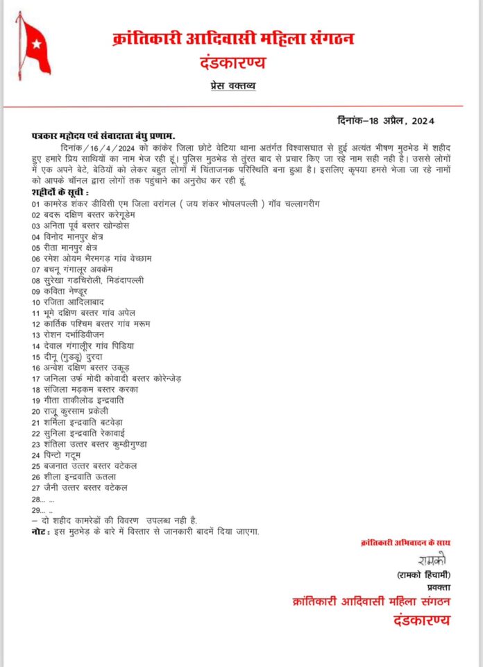 क्रांतिकारी आदिवासी महिला संगठन दंडकारण्य की प्रवक्ता रामको हिचमी ने बस्तर संभाग के सुकमा जिले में एक सूची जारी की है। इस सूची में कांकेर जिले के छोटे बेठिया के जंगल में दो दिन पहले सुरक्षा बलों के साथ हुई मुठभेड़ में मारे गए 27 नक्सलियों के नाम शामिल हैं। जबकि मुठभेड़ में 29 नक्सली मारे गए हैं और सभी के शव बरामद भी कर लिए गए हैं। बुधवार को नक्सलियों के परिजन शव लेने पाखांजुर पहुंचे थे। दो नक्सलियों के नाम इस सूची में नहीं हैं। वहीं रामको हिचमी का कहना है कि पुलिस ने मारे गए नक्सलियों के जो नाम बताए हैं, वह गलत हैं। इसके कारण लोगों में और मृतकों के परिजनों में भ्रम की स्थिति पैदा हो गई है। आदिवासी क्रांतिकारी आदिवासी महिला संगठन दंडकारण्य द्वारा जारी सूची में शीर्ष पर शंकर का नाम है। शंकर नक्सली संगठन में डीवीसीएम था। वह आंध्रप्रदेश के वारंगल जिला अंतर्गत भोपलपल्ली के गांव चल्लागरिग का निवासी था। शेष नक्सलियों में बदरू निवासी करेगुडेम दक्षिण बस्तर, अनिता निवासी खोंडोस पूर्व बस्तर, विनोद मानपुर क्षेत्र, रीता मानपुर क्षेत्र, रमेश ओयम ग्राम वेच्छाम भैरमगढ़, बचनू ग्राम अवकेम गंगालूर, सुरेखा ग्राम मिडंदापल्ली गढ़चिरौली महाराष्ट्र, कविता ग्राम नेंडूर, रजिता आदिलाबाद, भूमे ग्राम अपेल दक्षिण बस्तर, कार्तिक ग्राम मरूम पश्चिम बस्तर, रोशन दरभा डिवीजन, देवाल ग्राम पीड़िया गंगालूर, दीनू उर्फ गुड्डू ग्राम दुरदा, अण्वेष ग्राम उकुड़ दक्षिण बस्तर, संजिला मड़कम ग्राम करका बस्तर, जनिला उर्फ मोदी कोवादी ग्राम कोरेंजेड़ बस्तर, गीता ताकीलोड इंद्रावती, राजू क़ुरसाम ग्राम परकेली, शर्मिला बटवेड़ा इंद्रावती, सुनीला रेकावाई इंद्रावती, शंतिला ग्राम कुम्डीगुंडा उत्तर बस्तर, पिंटो गटूम, बजनाथ वटेकल उत्तर बस्तर, शीला ग्राम उतला इंद्रावती और जैनी वटेकल उत्तर बस्तर के नाम शामिल हैं
