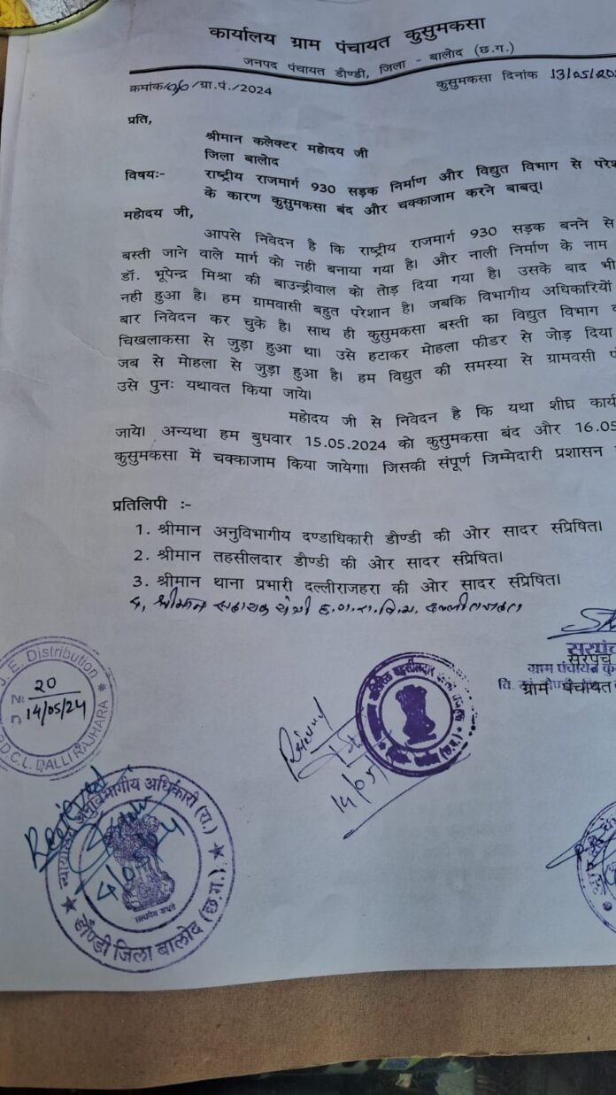 कुसुमकसा __राष्ट्रीय राजमार्ग 930 के तहत सड़क चौड़ीकरण व उन्नयन कार्य में नाली निर्माण में की जा रही कोताही व दिन में अनेकों मर्तबा हो रही विद्युत कटौती व मोहला मानपुर फीडर को कुसुमकसा में जोड़ने के विरोध में 15 मई बुधवार को कुसुमकसा के व्यापारिक प्रतिष्ठान बंद कर विरोध प्रदर्शन किया जाएगा व ग्रामीणों की समस्या का समुचित समाधान ना होने पर 16मई गुरुवार को चक्काजाम करने का ज्ञापन कलेक्टर के नाम अनुविभागीय अधिकारी दल्लीराजहरा कार्यालय में दिया गया ,व्यापारी संघ कुसुमकसा के अध्यक्ष प्रकाशचंद्र कुचेरिया ने बंद को समर्थन देने की बात कही