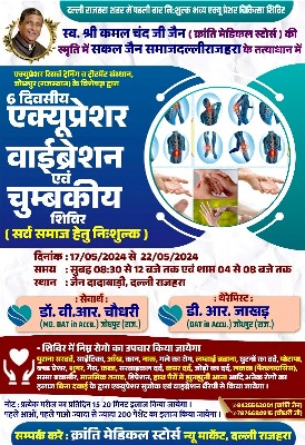 स्वर्गीय कमलचंद जैन (क्रांति मेडिकल स्टोर्स) की स्मृति में सकल जैन समाज के तत्वाधान में 6 दिवसीय एक्यूप्रेशर सूजाक वाइब्रेशन एवं चुंबकीय शिविर का आयोजन 17 मई से 22 मई तक किया जा रहा है यह शिविर जैन दादाबाड़ी दल्ली राजहरा में सुबह 8:00 बजे से दोपहर 12:00 तक एवं शाम 4:00 से रात्रि 8:00 बजे तक आयोजित होगा।शिविर में जोधपुर राजस्थान से डॉक्टर वी.आर.चौधरी एवं थैरेपिस्ट डी. आर.जाखड़ उपस्थित रहेंगे ।