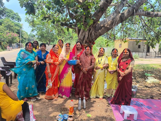 दल्लीराजहरा। आज लौह अयस्क नगरी की सुहागिन महिलाओं ने गुरुवार 06 जून 2024 को ज्येष्ठ मास कृष्ण पक्ष की अमावस्या तिथि को वट सावित्री के शुभ अवसर पर व्रत रखकर वट वृक्ष की पूजा अर्चना की। इसी क्रम में बीएसपी सेन्ट्रल टाउनशिप स्ट्रीट नं.10, वार्ड नं.22 के कला मंच दल्लीराजहरा के समीप स्थित वट वृक्ष (बरगद) की वैदिक विधि विधान से पूजा अर्चना कर मौसमी फल,फूल, भीगे चने, मिष्ठान, सोहाग की सामान व श्रीफल चढ़ाकर, सती सावित्री व सत्यवान की पौराणिक कथा श्रवण कर ,वट वृक्ष के 108 फेरे (परिक्रमा) लगाए तथा कच्चा धागा लपेटे। इस अवसर पर श्रीमती ममता शर्मा ,श्रीमती राधा मिश्रा, श्रीमती सीमा राजोरिया, श्रीमती शारदा देवांगन, श्रीमती लता कुलदीप, श्रीमती उमा ढ़ोले, श्रीमती प्रमिला नायक, श्रीमती लीना देवांगन, श्रीमती मौसमी, श्रीमती लीला राव,श्रीमती शांति साहू आदि महिलाएं उपस्थित रहे। श्रीमती ममता शर्मा ने बताया की ज्येष्ठ मास की कृष्ण पक्ष की अमावस्या तिथि को सनातनी सुहागिन महिलाएं अपने पति की दीर्घायु व अच्छी सेहत के लिए वट सावित्री व्रत रखती है और परिवार सहित सभी के लिए मंगल की कामना करते हुए वट वृक्ष (बरगद) की विधि विधान से पूजा अर्चना करती हैं।इसके अतिरिक्त ज्येष्ठ मास की अमावस्या तिथि को शनि जयंती भी मनाया जाता है।इसलिए उपस्थित सुहागिन महिलाओं ने समीप के पीपल वृक्ष की भी पूर्ण विधि विधान से पूजा अर्चना कर फेरे लगाए व अपने परिवार सहित सभी के लिए मंगलकामना की।