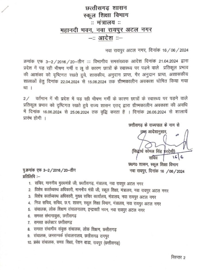 रायपुर छत्तीसगढ़ सरकार विष्णुदेव साय ने स्कूल खुलने को लेकर एक बड़ा फैसला लिया है। पहले 15 जून तक ग्रीष्मकालीन अवकाश था और 16 जून से स्कूल खुल जाना था। इसके बाद एक आदेश के बाद 19 जून तक इसे बढ़ाया गया और अब एक नया आदेश निकल गया है जिसमें आप 25 जून तक ग्रीष्मकालीन अवकाश रहेगा और 26 जून से स्कूल खुलेंगे।