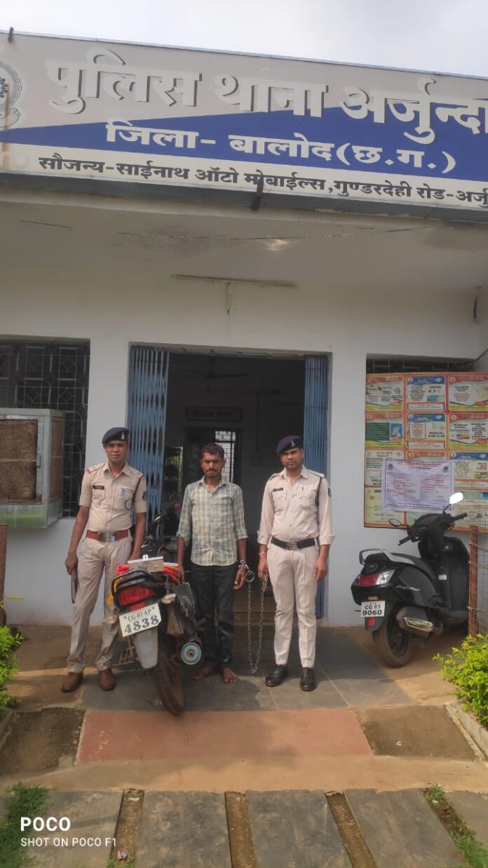 – मामले का विवरण इस प्रकार है कि प्रार्थी नारेंद्र प्रजापति पिता बिसुन प्रजापति उम्र 24 साल, साकिन डुडिया थाना अर्जुंदा जिला बालोद द्वारा रिपोर्ट दर्ज कराया कि दिनांक 12.07.2024 करीबन 12.00 से 01.00 बजे के मध्य इसके डुडिया तालाब के पास स्थित कच्चा मकान में कोई अज्ञात चोर द्वारा कच्चे घर के कमरे में झाला से आकर दीवाल तोड़कर घर के अन्दर घुसकर झोले (थैला) में रखा 70,000 रू को चोरी कर ले गया है। कि रिपोर्ट पर अपराध पंजीबद्ध कर विवेचना में लिया गया। विवेचना के दौरान घटना स्थल निरीक्षण ,प्रार्थी व आस पास के लोगो से पूछताछ करने के बाद संदेही मेहत्तरू राम हल्बा को थाना तलब कर पूछताछ किया गया, जो अपराध घटित करना स्वीकार करते हुए बताया कि घटना दिनांक 12.07.2024 के करीबन 11.30 बजे अपने मोटर सायकल क्रं0 सी0जी0 07 एपी 4838 होण्डा साईन से नारेन्द्र प्रजापति के घर डुडिया जाकर 100 रू0 पैसा मांगा जो कि नारेन्द्र पैसा देने से मना कर दिया। आरोपी मेहत्तरू ठाकुर भठ्ठा के आस पास कुछ दूर जाकर खडा था। नारेंद्र प्रजापति भालूकोन्हा रमेश प्रजापति के ईंट भठठा में काम करने चला गया तथा नारेंद्र प्रजापति की पत्नि सुनीता प्रजापति अपने छोटे लडके को लेकर नहाने तालाब चली गई। उसके बाद आरोपी प्रार्थी के कच्चा मकान घर के बगल कमरे में जाकर कच्चे दीवार के ईंट को हाथ से मारकर व इंर्टों को अलग निकालकर बड़ा छेद बनाकर घर में घूस गया व कमरे में इधर उधर पैसा समानों में ढूढने लगा जो सफेद रंग के थैला में स्टील संदूक बाक्स में रखे पैसे को संदूक सहित चोरी कर अपने मोटर सायकल से लेकर चले जाना बताया। आरोपी मेहतरू ठाकुर द्वारा घटना में प्रयुक्त मोटर सायकल , स्टील के संदूक ,चोरी के पैसा से खरीदे गये मोबाईल, नगदी रकम को जप्त किया गया। आरोपी मेहतरू ठाकुर पिता रामनिवास ठाकुर, उम्र 30 वर्ष, साकिन कठिया, थाना अर्जुंदा, जिला बालोद छ0ग0 को गिरफ्तार कर न्यायिक रिमांड पर भेजा गया है।
