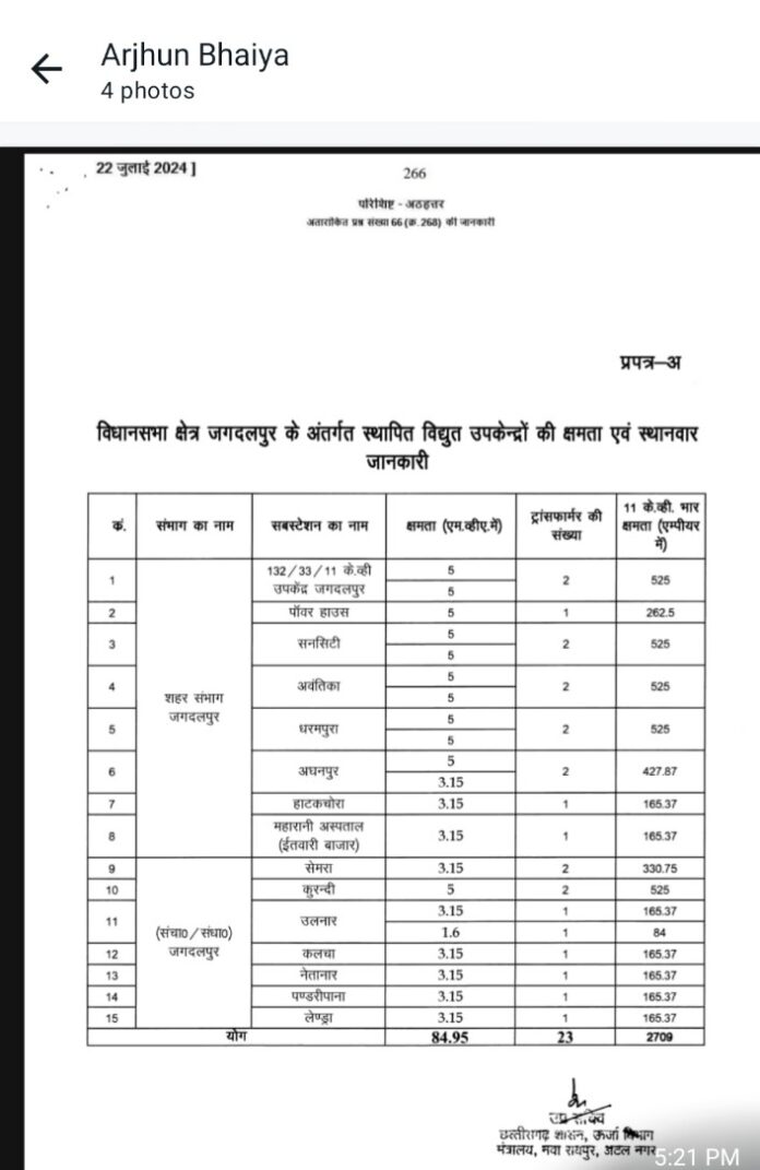 जगदलपुर विधानसभा क्षेत्र अंतर्गत वर्ष 2023-24 में किसी भी नवीन विद्युत उप केंद्र का प्रस्ताव नहीं था, किन्तु पूर्व के वित्तीय वर्ष में प्रस्तावित 03 नग नवीन विद्युत उप केन्द्र नेतानार, पंडरीपानी एवं ईतवारी बाजार जगदलपुर का कार्य वित्तीय वर्ष 2023-24 में पूर्ण किया गया है। कुम्हारपारा जगदलपुर में 1 तथा 2 उप केन्द्र धुरगुड़ा एवं नियानार में वर्ष 2024-25 के लिए प्रस्तावित हैं। योजना वित्तीय स्वीकृति न मिलने से ठंडे बस्ते में चली गई है।