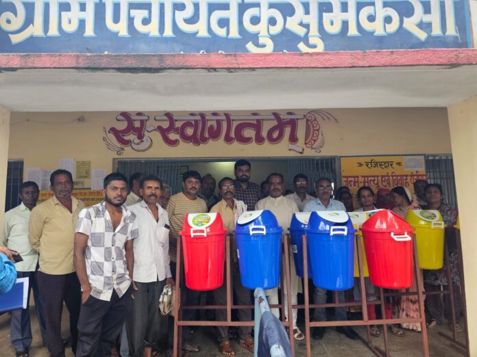 कुसुमकसा ग्राम पंचायत को जनपद सदस्य संजय बैंस ने अपने जनपद निधि से सुखा गीला कचरा रखने के लिए 50 नग स्टेंड सहित डस्टबीन वितरण किया इस अवसर पर जनपद पंचायत के मुख्य कार्यपालन अधिकारी श्री मंडाले जी प्रोग्राम अधिकारी वर्मा जी सब इंजीनियर रामटेके जी उपस्थित रहे कार्यक्रम में सरपंच शिव राम सिंदरामे जी बताया की हमारे ग्राम पंचायत के सभी चौक सहित स्कूल हासपीटल आगनवाड़ी में इस डस्ट बीन को लगाया जाएगा हमारे जनपद सदस्य संजय बैंस स्वच्छ ग्राम की दिशा में एक कदम गांव को स्वच्छ रखने की पहल की है जनपद पंचायत के मुख्य कार्यपालन अधिकारी मांडाले जी ने कहा की मेरे जनपद पंचायत में इतने सारे डस्टबीन वितरण करने वाले पहले जनपद सदस्य बैंस जी है उनके सभी कार्य प्रांशनीय रहते है।
