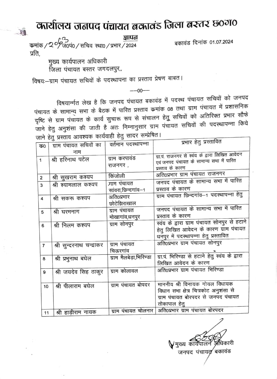 कार्यालय जनपद पंचायत बकावंड जिला बस्तर छत्तीसगढ़ के ज्ञापन क्रमांक2063 / जं०पं० / सचिव स्था०/प्रभार / 2024 बकावंड दिनांक 01.07.2024 को ज्ञापन बकावंड के मुख्य कार्यपालन अधिकारी के हस्ताक्षर से जिला पंचायत के मुख्य कार्यपालन अधिकारी को भेजा गया है।* *मुख्य कार्यपालन अधिकारी ने उल्लेखित किया है कि जनपद पंचायत बकावंड में पदस्थ पंचायत सचिवों को जनपद पंचायत के सामान्य सभा के बैठक में पारित प्रस्ताव क्रमांक 08 तथा ग्राम पंचायत में प्रशासनिक दृष्टि से ग्राम पंचायत के कार्य सुचारू रूप से संचालन हेतु सचिवों को अतिरिक्त प्रभार सौंपा जाना है । ग्राम पंचायत सचिवों की पदस्थापन्ना किये जाने हेतु प्रस्ताव को भेजा गया है,अब ऐसे सचिवों के नाम सामने आ गए हैं जो कथित रूप से अधिकारी के चेहते हैं जिसके कारण उनके आदेश को निरस्तीकरण किए जाने के लिए पत्राचार किया जा रहा है।