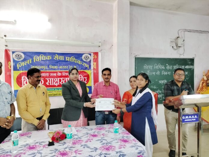 आज दिनांक 8 अगस्त 2024 को जिला विधिक सेवा प्राधिकरण जगदलपुर के सौजन्य से विश्व आदिवासी दिवस के उपलक्ष्य में जगतु माहरा शासकीय उच्चतर माध्यमिक विद्यालय जगदलपुर में विधिक सहायता कार्यक्रम का आयोजन किया गया है ,इस कार्यक्रम में मुख्य अतिथि के रूप में सुश्री अंकिता कश्यप व्यवहार न्यायाधीश एवं सचिव जिला विधिक सेवा प्राधिकरण जगदलपुर ने विश्व आदिवासी दिवस के अवसर पर आदिवासी समाज के विकास में आने वाली समस्याओं के विषय में विद्यार्थियों को जानकारी दी साथ ही उनके कला संस्कृति संगीत जीवन शैली पर्यावरण संरक्षण के विषय में विद्यार्थियों को बताते हुए यह कहा कि हमें आदिवासी संस्कृति का सम्मान करना चाहिए इस अवसर पर उन्होंने विद्यार्थियों को जीवन में आने वाली समस्याओं के हल के रूप में शिक्षा का महत्व समझाया और कहा कि, शिक्षा के माध्यम से ही हम अपने जीवन को सफल बना सकते हैं विधिक सेवा प्राधिकरण के तत्वाधान में ही विद्यालय में निबंध प्रतियोगिता का आयोजन किया गया था जिसका शीर्षक प्रकृति संरक्षण था।इस प्रतियोगिता में विद्यालय की कुमारी प्रमिला सेठिया ने तृतीय स्थान कुमारी निधि इंजापुरी ने द्वितीय स्थान, और दीपक सिंह ने प्रथम स्थान प्राप्त किया