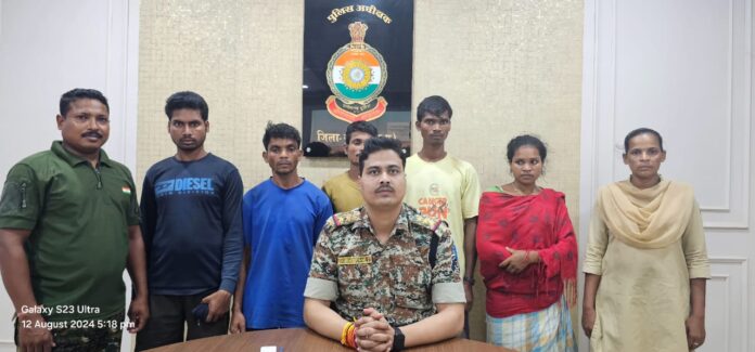 नक्सलियों की उपस्थिति की सूचना पर 12 अगस्त को थाना जगरगुंडा से एसडीओपी तोमेश वर्मा जगरगुंडा के नेतृत्व में उप निरीक्षक सोड़ी कन्ना डीआरजी हीरो एवं प्रधान आरक्षक बारसे भीमा डीआजरी इंडिया के हमराह जिला बल, डीआरजी का बल एवं कुदेंड कैंप से हर्षदीप रंधावा सहायक कमांडेंट 165 वाहिनी सीआरपीएफ की संयुक्त पार्टी नक्सल गश्त सर्चिंग पर ग्राम मिसीगुड़ा व आसपास क्षेत्र की ओर रवाना हुई थी।अभियान के दौरान मिसीगुड़ा केे जंगल पहाड़ी चिकोमेट्टा के पास कुछ संदिग्ध व्यक्ति पुलिस पार्टी को देखकर छुपने भागने लगे। टीम ने घेराबंदी कर 5 संदिग्ध व्यक्तियों को पकड़ा गया। पकड़े गए व्यक्तियों में उईका चैतू पिता सुकलु पूर्व एसीएम परमिली एरिया कमेटी सदस्य, गढ़चिरौली महाराष्ट्र) ईनामी 5 लाख रुपए जाति मुरिया निवासी पटेलपारा थाना जगरगुंडा सुकमा, कुंजाम सुखलाल पिता सोमालू मिलिशिया सदस्य, इंद्रावती एरिया कमेटी जाति मुरिया निवासी पांडूपारा थाना जगरगुंडा, पदाम हुंगा पिता पदाम पंडा मिलिशिया सदस्य, जीआरडी कमांडर जाति मुरिया निवासी पांडूपारा थाना जगरगुंडा, महिला उईका लखे पिता उईका हुंगा सीएनएम सदस्य, चिन्नागेलूर एरिया जाति मुरिया निवासी मिसीगुड़ा पटेलपारा, थाना जगरगुंडा और पदाम सन्नू पिता सोमालू मिलिशिया सदस्य जाति मुरिया निवासी मिसीगुड़ा पांडूपारा थाना जगरगुंडा शामिल हैं। उईका चैतू से 100 ग्राम बारुद, टाईगर बम, डेटोनेटर 2 नग, माचिस 1 नग, कुंजाम सुखलाल के कब्जे से बीजीएल सेल 1 नग, जिलेटिन रॉड 2 नग, कोर्डेक्स वॉयर 1 मीटर, पदाम हूंगा से बारुद 100 ग्राम, 2 नग डेटोनेटर, पेंसिल सेल 2 नग, नक्सल साहित्य, उईका लखे से 2 नग जिलेटिन रॉड, कोर्डेक्स वॉयर, टॉप टाइगर बम 1 नग, माचिस 1 नग और पदाम सेामलू के कब्जे से जिलेटिन रॉड 2 नग, कोर्डेक्स वॉयर 1 नग, बिजली वॉयर 3 मीटर, पेंसिल सेल 1 नग बरामद किए गए। पूछताछ में इन लोगों ने बताया कि बड़े नक्सलियों के आदेश पर सुरक्षा बलों को नुकसान पहुंचाने की नीयत से यह सामग्री रखी थी तथा मौका पाकर सुरक्षा बलों के आने- जाने वाले मार्ग में आईईडी लगाने के लिए आने की बात स्वीकार की है। नक्सलियों के खिलाफ थाना जगरगुंडा में विस्फोटक पदार्थ अधिनियम के तहत प्रकरण पंजीबद्ध कर उन्हें न्यायालय में पेश कर न्यायिक रिमांड पर जेल भेजा गया। घटना में शामिल अन्य नक्सलियों की गिरफ्तारी हेतु क्षेत्र में लगातार विशेष अभियान चलाया जा रहा है।
