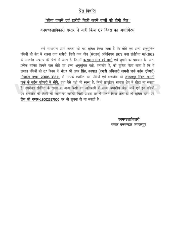 वैसे किसी भी वन्य प्राणी को घरों में बंधक बनाकर रखना गैर कानूनी है, चाहे वह तोता ही क्यों न हो। वैसे तोते व कुत्ते का मनुष्य के साथ अनादि काल से मधुर रिश्ता चला आ रहा है। सनातन धर्म में तोते को बड़ा ही शुभ पक्षी माना जाता है। यह वाचाल पक्षी बहुत जल्दी मनुष्य की भाषा सीख जाता है और मनुष्य की भाषा में ही बोलने लग जाता है। एक दौर था जब अमूमन हर घर में तोता नजर आ जाता था। राजा महाराजा भी तोता पालते थे। तोता को लेकर कई कहावतें प्रचलित हैं, जैसे तोता रटंत, अपने मुंह मिया मिट्ठू बनना, हाथ से तोते उड़ जाना, रट्टू तोता, तोते की तरह टर्र टर्र करना आदि। वही तोते बोलने में सिद्धहस्त होते हैं, जिसे शिशु अवस्था से पाला जाता है। तोते की वाचालता और मिलनसारिता के चलते ही मनुष्य शुरू से तोते पालने का शौकीन रहा है। घर घर में तोतों की आवाज सुनाई देती थी। उनके मुंह से राम राम सुनना बड़ा ही सुखद लगता है। मगर अब छत्तीसगढ़ शासन के वन विभाग को मनुष्य और तोते का यह रिश्ता रास नहीं आ रहा है। तोता या किसी भी पक्षी अथवा जानवर को घरों में बंधक रखना वन्य जीव संरक्षण अधिनियम के तहत गैर कानूनी है। इसी अधिनियम का हवाला देते हुए वन विभाग ने तोते बेचने या पालने पर रोक लगा दी है। बस्तर डीएफओ ने इसी तारतम्य में एक आदेश जारी किया है। इस आदेश में कहा गया है कि जिन भी घरों में तोते हैं, उन घरों के मालिक तोतों को जगदलपुर लामनी पार्क में पंछी विहार में पहुंचा दें। ऐसा न करने वालों को 3 साल के कारावास की सजा हो सकती है। यानि जिस तोते को आपने वर्षों पिंजरे में रखकर अपने अपने परिवार के सदस्य की तरह उसकी देखभाल की है, उसी तोते की वजह से आपको सरकारी पिंजरे में तीन साल तक बंद रहना पड़ सकता है।