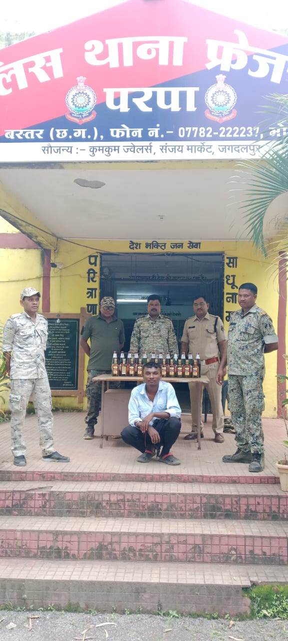 पुलिस अधीक्षक शलभ सिन्हा के निर्देशन में बस्तर पुलिस द्वारा अपराधी तत्वों के विरूद्ध लगातार कार्रवाई की जा रही है। इसी क्रम में अवैध शराब बिक्री पर फ्रेजरपुर परपा पुलिस ने कार्रवाई की है। मुखबिर से मिली सूचना के आधार पर परपा थाना पुलिस द्वारा ग्राम पल्ली कबाड़ी दुकान के पहले मेन रोड़ से ग्राम पल्ली जाने वाले रोड़ पर पिट्ठू बैग में अंग्रेजी शराब बिक्री हेतु परिवहन करने के लिए यात्री वाहन का इंजतार कर रहे युवक देवसन कश्यप को पकड़ा। पुलिस अधीक्षक शलभ कुमार सिन्हा एवं अतिरिक्त पुलिस अधीक्षक महेश्वर नाग के मार्गदर्शन तथा एसडीओपी केशलूर विश्वदीपक त्रिपाठी के पर्यवेक्षण में थाना प्रभारी परपा दिलबाग सिंह के नेतृत्व में गठित टीम द्वारा ग्राम पल्ली गांव में देवसन को पकड़कर व उसके बैग से 11 नग मैगडावल नंबर-1 की अद्धी, 12 नग स्टेरेन 8 बियर की बोतलें जप्त की गईं। 34 (2) आबकारी एक्ट के तहत आरोपी देवसन कश्यप को गिरफ्तार कर न्यायिक रिमांड पर भेजा गया। आरोपी को पकड़ने में परपा थाने के निरीक्षक दिलबाग सिंह, उप निरीक्षक हंस कुमार ठाकुर, सहायक उप निरीक्षक अजीत सिंह व मीना यादव, प्रधान आरक्षक चंदन गोयल, आरक्षक शिवेंद्र ध्रुव, रवींद्र कुमार ठाकुर की विशेष भूमिका रही।