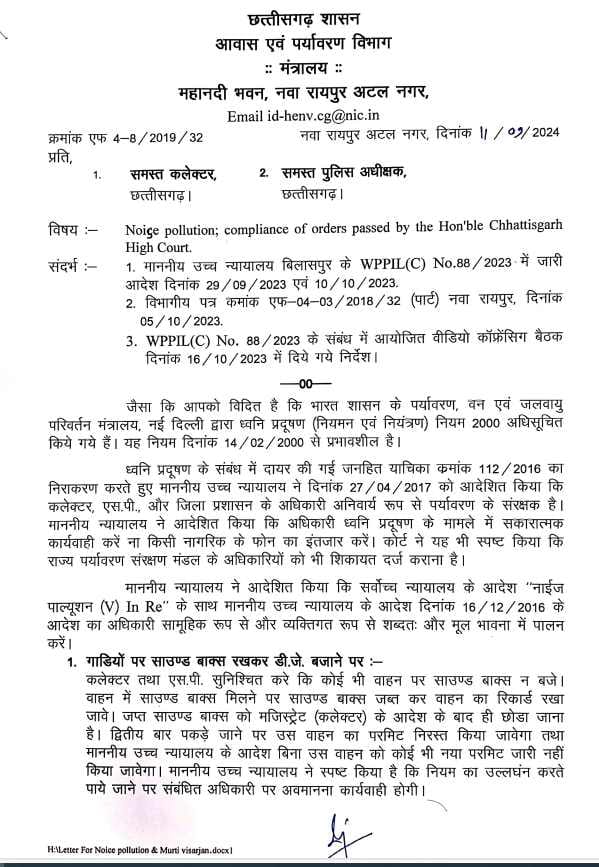 छत्तीसगढ़ आवास एवं पर्यावरण विभाग ने प्रदेश के सभी कलेक्टर और SP को पत्र लिखकर साउंड पॉल्यूशन कंट्रोल करने के लिए आदेश जारी किया है। यह आदेश विशेष सचिव देवेंद्र सिंह भारद्वाज ने जारी किया है। आदेश के मुताबिक गाडियों पर DJ बॉक्स रखकर बजाने पर कार्रवाई के निर्देश दिए हैं।जैसा कि आपको विदित है कि भारत शासन के पर्यावरण, वन एवं जलवायु परिवर्तन मंत्रालय, नई दिल्ली द्वारा ध्वनि प्रदूषण (नियमन एवं नियंत्रण) नियम 2000 अधिसूचित किये गये हैं। यह नियम दिनांक 14/02/2000 से प्रभावशील है।
