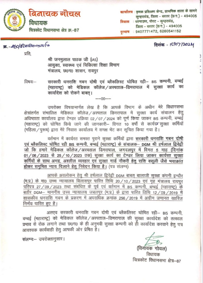 गोयल ने कहा है कि आपके अवलोकन हेतु हर्षलाल द्विवेद्वी डीजीएम बाबत् बालाजी सुरक्षा कंपनी इन्दौर (म.प्र.) के मा० उच्च न्यायालय बिलासपुर पारित तिथि 20/10/2023 एवं गृह मंत्रालय रायपुर परिपत्र 27/09/2023 तथा संबंधित के पूर्व एवं वर्तमान में बीआईएस कम्पनी, बम्बई (महाराष्ट्र) के बतौर डीजीएम को माननीय उच्च न्यायालय जबलपुर (म.प्र.) द्वारा पारित तिथि 12/09/2019 में शासकीय धनराशि गबन के प्रकरण में अपराधिक क्रमांक 256/2019 में अग्रीम जमानत खारिज किया गया है। उक्त कंपनी को मेडिकल कॉलेज अस्पताल डिमरापाल में कार्यादेश दिया गया है जिसको रोका जाए।