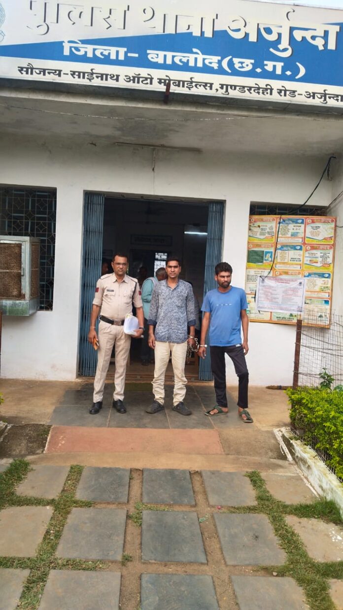 पुलिस महानिरीक्षक महोदय दुर्ग राम गोपाल गर्ग, पुलिस अधीक्षक महोदय सुरजन राम भगत के मार्गदर्शन में अतिरिक्त पुलिस अधीक्षक महोदय अशोक कुमार जोशी एवं अनुविभागीय अधिकारी पुलिस गुण्डरदेही श्रीमति गीता वाधवानी के पर्यवेक्षण में थाना प्रभारी अर्जुन्दा टीम द्वारा मुखबीर की सूचना पर टीम गठित कर थाना अर्जुन्दा के अप0क्र0 157/2024 धारा धारा 296, 115(2), 351(2), 3(5), 221, 132, 117 (2),121(2) बीएनएस एवं छ0ग0 चिकित्सा सेवक तथा चिकित्सा सेवा संस्थान अधि0 2010 की धारा 3 के आरोपी 1. रितेश उर्फ गोरिया गांधी पिता स्व0 संपत गांधी उम्र 34 साल साकिन वार्ड क्रमांक 14 अर्जुन्दा थाना अर्जुन्दा वर्तमान पता- कुशालपुर दन्तेश्वरी मंदिर के पास थाना पुरानी बस्ती, जिला रायपुर 02. द्रिवेश उर्फ डम्पी देवांगन पिता स्व0 जगदीश प्रसाद देवांगन उम्र 29 साल साकिन जगन्नाथ मंदिर के पास अश्वनी नगर थाना पुरानी बस्ती, जिला रायपुर छ0ग0 की पता तलाश कर गिर0 कर न्यायिक रिमाण्ड पर जेल भेजा l