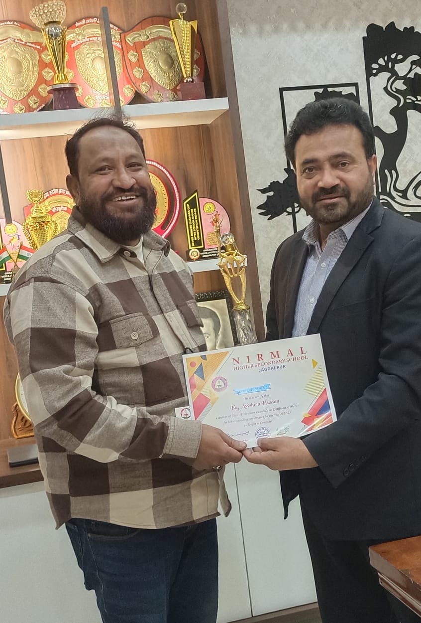 निर्मल विद्यालय जगदलपुर में गणित और कम्प्यूटर साइंस की स्टूडेंट रही अशविरा हुसैन बड़ी ही मेधावी छात्रा है। अशविरा निर्मल स्कूल से पढ़ाई पूरी करने के बाद प्रतियोगी परीक्षा में सिलेक्ट होकर देश की सबसे प्रतिष्ठित शैक्षणिक संस्था नेशनल इंस्टीट्यूट ऑफ टेक्नोलॉजी (एनआईटी) में इंजिनियरिंग की पढ़ाई कर रही है। पहले स्कूली बोर्ड परीक्षा में शानदार रिजल्ट लाकर अवशिरा हुसैन ने अपने अब्बू अम्मी का मान बढ़ाया, फिर सबसे कठिन प्रतियोगी परीक्षा में सफल होने के बाद एनआईटी में पढ़ाई के लिए चयनित होकर के पिता अनवर हुसैन का सीना गर्व से और भी चौड़ा कर दिया। पिता अनवर हुसैन के लिए तो अशविरा खुशियों की नेमत लेकर इस दुनिया में आई है। अनवर हुसैन का सीना तब 56 इंच को पार कर गया, जब बेटी की उपलब्धि पर निर्मल स्कूल प्रबंधन ने उन्हें सम्मानित किया। पिता अनवर हुसैन खुशी से फुले नहीं समा रहे थे। बड़े नसीब वालों को मिलती है अशविरा जैसी बेटी।अनवर हुसैन कहते हैं कि ऎसी बेटियां सचमुच सौभाग्य से मिलती हैं। उन्होंने सभी माता पिता से अपील की है कि अपनी बेटियों को खूब पढ़ाएं, उन्हें हर तरह की खुशियां और सुविधाएं दें, बेटा बेटी में फर्क न करें।