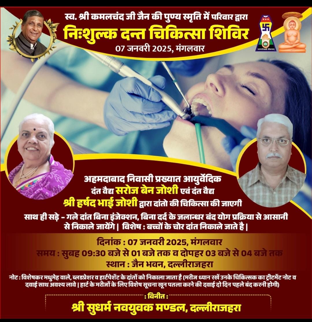 दल्लीराजहरा विगत वर्षों से दल्ली राजहरा कि जनता के मांगों को देखते हुए निशुल्क दंत चिकित्सा शिविर का आयोजन दिनांक 07/01/2025 दिन मंगलवार को स्व. कमल चंद जी जैन के स्मृति में एवं सुधर्म नवयुवक मण्डल दल्ली राजहरा के तत्वाधान मे जैन भवन मे किया जा रहा है जिसमें अहमदाबाद निवासी प्रख्यात आयुर्वेदिक दंत वैद्य श्रीमति सरोजबेन जोशी एवं दंत वैद्य हर्षद भाई जोशी द्वारा सड़े गले दांत बिना इंजेक्शन बिना दर्द के जालंधर बंध योग प्रक्रिया से आसानी से निकाले जाएंगे ।विशेष:- शुगर पेशेंट, ब्लड प्रेशर और हार्ट पेशेन्ट के टेस्ट कर दांत तुरंत निकाले जाएंगे । नगर वाशियों से निवेदन है की अग्रिम पंजीयन् कराकर शिविर का लाभ अवश्य लेवें..