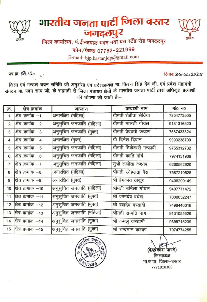 Home छत्तीसगढ़ क्षेत्रीय समाचार भाजपा ने की बस्तर जिला पंचायत क्षेत्र के अधिकृत प्रत्याशियों की घोषणा