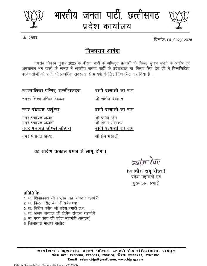बालोद नगरीय निकाय चुनाव 2025 के दौरान पार्टी के अधिकृत प्रत्याशी के विरुद्ध चुनाव लड़ने के आरोप एवं अनुशासन भंग करने के मामले में भारतीय जनता पार्टी के प्रदेशाध्यक्ष किरण सिंह देव ने भाजपा के बागी कार्यकर्ताओं को पार्टी की प्राथमिक सदस्यता से 6 वर्षों के लिए निष्कासन कर दिया गया है।