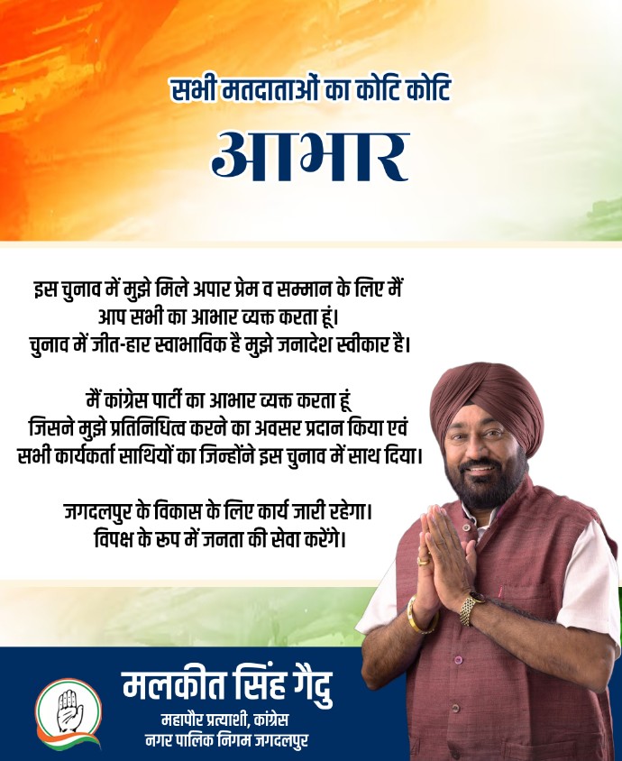 जगदलपुर नगर निगम जगदलपुर से कांग्रेस के महापौर प्रत्याशी मलकीत सिंह गैदू ने चुनाव में मिले अपार प्रेम व सम्मान के लिए शहर के मतदाताओं का आभार व्यक्त किया है। मलकीत सिंह ने कहा कि चुनाव में जीत-हार स्वाभाविक है मुझे जनादेश स्वीकार है। गैदू ने कांग्रेस पार्टी का आभार व्यक्त करते हुए कहा कि पार्टी ने मुझे प्रतिनिधित्व करने का अवसर प्रदान किया एवं सभी कार्यकर्ता साथियों का जिन्होंने इस चुनाव में साथ दिया। उन्होंने कहा है कि जगदलपुर के विकास के लिए उनका संघर्ष जारी रहेगा। विपक्ष के रूप में वे जनता की सेवा करते रहेंगे।