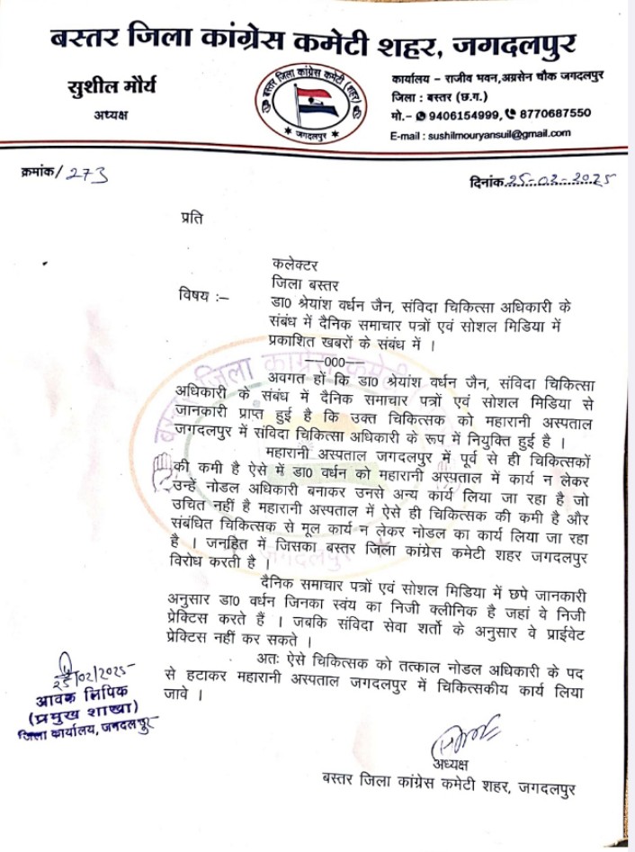 जगदलपुर शहर जिला कांग्रेस कमेटी के अध्यक्ष सुशील मौर्य ने कहा है कि डॉ. श्रेयांश वर्धन जैन को महारानी अस्पताल जगदलपुर में संविदा चिकित्सा अधिकारी के रूप में नियुक्ति दी गई है। महारानी अस्पताल में पूर्व से ही चिकित्सकों की कमी है ऐसे में डॉ. जैन से महारानी अस्पताल में कार्य न लेकर उन्हें नोडल अधिकारी बनाकर उनसे अन्य कार्य लिया जा रहा है जो उचित नहीं है। महारानी अस्पताल में ऐसे ही चिकित्सक की कमी है और डॉ जैन से मूल कार्य न लेकर नोडल अधिकारी का कार्य लिया जा रहा है। जनहित में जिसका बस्तर जिला कांग्रेस कमेटी शहर जगदलपुर विरोध करती है। डॉ. जैन निजी प्रेक्टिस भी करते हैं। जबकि संविदा सेवा शर्तों के अनुसार वे प्राईवेट प्रेक्टिस नहीं कर सकते। अतः ऐसे चिकित्सक को तत्काल नोडल अधिकारी के पद से हटाकर महारानी अस्पताल जगदलपुर में चिकित्सकीय कार्य लिया जाए।