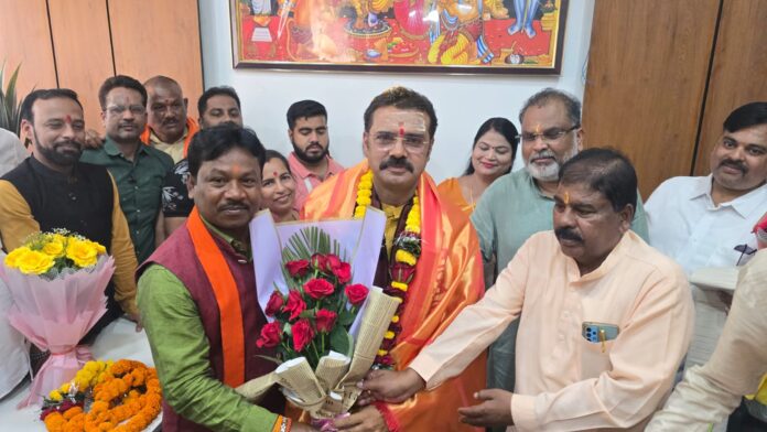 नगर निगम कार्यालय जाने से पहले मेयर संजय पांडे माई दंतेश्वरी के मंदिर पहुंचे, जहां उन्होंने विधि विधान से पूजा अर्चना की। निगम कार्यालय में शुभ मुहूर्त पर उन्होंने नगर निगम महापौर के रूप में अपने पहले कार्यकाल की शुरुआत करते हुए पदभार ग्रहण किया। नए महापौर के चेंबर को बहुत ही कम समय में तैयार किया गया है। रात दिन काम करके कारीगरों ने इसे नया रूप दिया है। महापौर जिस कुर्सी में बैठेंगे उसके पीछे एक राम दरबार का बड़ी फोटो लगाई गई है। वहीं कक्ष के भीतर प्रधानमंत्री के छायाचित्र के साथ ही क्रम से अन्य नेताओं और दिवंगत महापुरुषों की भी तस्वीरें लगाई गई हैं। मालूम हो कि चुनाव परिणाम के 13 दिन बाद 1 मार्च को शुभ मुहूर्त में संजय पाण्डे ने अपने पार्षदों के साथ उप मुख्यमंत्री अरुण साव, वन मंत्री केदार कश्यप, बस्तर सांसद महेश कश्यप, प्रदेश भाजपा अध्यक्ष एवं विधायक किरण सिंह देव तथा अन वरिष्ठ नेताओं, जनप्रतिनिधियों और प्रशासनिक अधिकारियों की मौजूदगी में शपथ ली थी । आज सुबह नगर निगम कार्यालय पहुंचकर महापौर ने पदभार ग्रहण किया। सांसद महेश कश्यप व सभी स्नेहीजनों ने उन्हें बुके भेंट कर बधाई दी। इससे पूर्व संजय पांडे अपनी धर्मपत्नी रेखा पांडे के साथ दंतेश्वरी मंदिर पहुंचे थे। इस अवसर पर बड़ी संख्या में भाजपा के नेता, वरिष्ठ नागरिक भी मौजूद रहे। निगम कार्यालय में बस्तर सांसद महेश कश्यप, पूर्व सांसद दिनेश कश्यप, वरिष्ठ भाजपा नेता श्रीनिवास राव मद्दी, पूर्व जिला पंचायत अध्यक्ष वेदवती कश्यप, पूर्व महापौर सफीरा साहू, भाजपा के वरिष्ठ नेतागण, सभी पार्षद, कार्यकर्ता, निगम के अधिकारी कर्मचारी उपस्थित रहे।