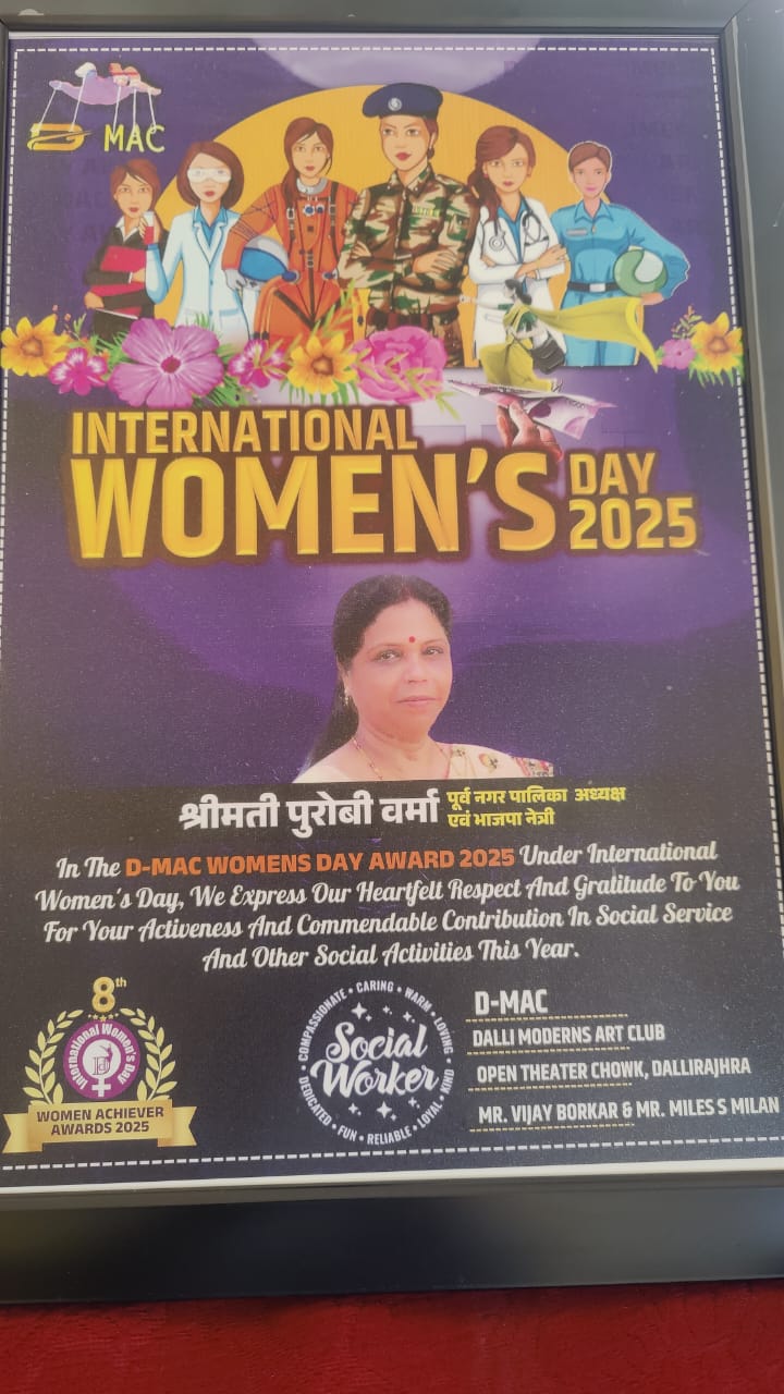 विश्व महिला दिवस के अवसर पर 8 मार्च को खनिज नगरी के ओपन एयर थिएटर में प्रसिद्ध संस्था डी मैक आर्ट द्वारा आयोजित भव्य समारोह में पुरोबी वर्मा को उक्त प्रतिष्ठित सम्मान से नवाजा गया। भाजपा नेत्री एवं पूर्व नगर पालिका अध्यक्ष पुरोबी वर्मा को यह पुरस्कार समाजसेवा के क्षेत्र में उनकी लगातार सक्रियता, महिलाओं के उत्थान और विकास के लिए उनके द्वारा किए गए कार्यों के दृष्टिगत प्रदान किया गया है यह पुरस्कार डी मैक आर्ट क्लब द्वारा राजहरा ओपन एयर थिएटर में उन्हें अंतरराष्ट्रीय महिला दिवस पर दिया गया। पुरस्कार मिलने पर श्रीमती वर्मा ने कहा कि मैं सर्वप्रथम इस संस्था को धन्यवाद देती हूं कि उन्होंने मुझे इस सम्मान के काबिल समझा, चूंकि मैं दो बार नगर पालिका अध्यक्ष रही हूं अतः मुझे मजदूर और अन्य वर्गों की महिलाओं के साथ काम करने का अवसर मिला। शासन द्वारा महिलाओं के लिए चलाई जा रही घरेलू उद्योग और रोजगारमुखी योजनाओं का प्रचार कर महिलाओं को अपने समय और सामर्थ्य का भरपूर उपयोग करते हुए पचासों महिलाओं को आत्मनिर्भर बनाने का काम किया। ऐसा करके मुझे आत्मिक शांति मिली। अब मैं बीजेपी की कार्यकर्ता बनकर महिलाओं की उन्नति में अपना योगदान देना चाहती हूं। डी मैक ने मुझे यह पुरस्कार देकर महिलाओं के लिए कार्य करने के लिए प्रेरित किया है मै उनके प्रति आभार व्यक्त करती हूं।