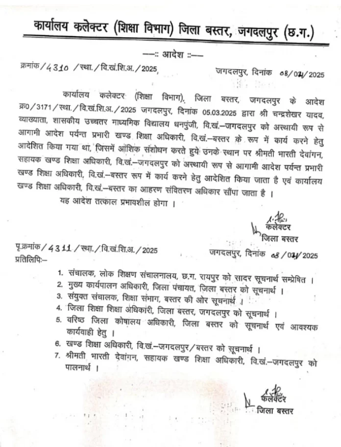 आदेश में कहा गया है कि पूर्व के आदेश में चंद्रशेखर यादव, व्याख्याता शासकीय उच्चतर माध्यमिक विद्यालय धनपूंजी, ब्लॉक जगदलपुर को अस्थायी रूप से आगामी आदेश तक प्रभारी खंड शिक्षा अधिकारी बस्तर के रूप में कार्य करने हेतु आदेशित किया गया था, जिसमें आंशिक संशोधन करते हुए उनके स्थान पर भारती देवांगन, सहायक खंड शिक्षा अधिकारी, विकास खंड जगदलपुर को अस्थायी रूप से आगामी आदेश तक प्रभारी खंड शिक्षा अधिकारी बस्तर रूप में कार्य करने हेतु आदेशित किया जाता है। श्रीमती देवांगन को कार्यालय खंड शिक्षा अधिकारी बस्तर के आहरण संवितरण अधिकार भी सौंपा गया है।