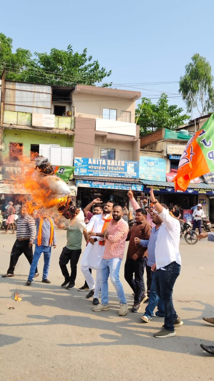 जगदलपुर नेशनल हेराल्ड में करोड़ों के कथित भष्ट्राचार के मामले को लेकर कांग्रेस के खिलाफ आक्रामक रूख अख्तियार करते हुए भारतीय जनता पार्टी के नेताओं और कार्यजार्ताओं ने आज शुक्रवार को कांग्रेस भवन का घेराव किया और विरोध प्रदर्शन करते हुए कांग्रेस भवन के सामने ही कांग्रेस नेत्री सोनिया गांधी और राहुल गांधी का पुतला फूंक डाला। भाजपा कार्यकर्ता पुलिस द्वारा बनाए गए बेरिकेट्स को तोड़ कर कांग्रेस भवन के समक्ष लगभग एक घंटे तक जोरदार नारेबाजी और विरोध प्रदर्शन करते हुए कांग्रेस भवन का घेराव करते डटे रहे। भारी संख्या में तैनात पुलिस बल जवानों के साथ भाजपा कार्यकर्ताओं की धक्कामुक्की लगातार होती रही।