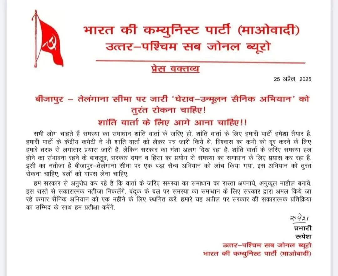 - उत्तर पश्चिम सब जोनल ब्यूरो के प्रभारी रुपेश ने जारी किया पत्र