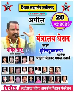 अतः छत्तीसगढ़ प्रदेश शासकीय शिक्षक फेडरेशन के प्रदेश अध्यक्ष- शंकर साहू, प्रदेश संरक्षक- रेखराम साहू, अनिल रामटेके, कार्यकारी प्रदेश अध्यक्ष- संजय मेहर, नरेंद्र लाल देवदास, दीपक प्रकाश एवं महिला प्रकोष्ठ प्रदेश संयोजक- हींना कश्यप, प्रदेश सचिव- अशोक कुमार तेता, प्रदेश कोषाध्यक्ष- तेजराम कामाड़िया, प्रदेश प्रवक्ता- हेमलता बढ़ाई, प्रभारी महामंत्री संगठन-जितेंद्र कुमार साहू, प्रदेश उपाध्यक्ष- प्रेमचंद सोनवानी, सूर्य लाल साहू, भुनेश्वरी सहारे, आनंद साहू, प्रदेश महासचिव- अनुपमा सोनी, मितेन्द्र कुमार बघेल, भूपेंद्र कुमार साहू,रत्नाकर खूंटिया, प्रदेश महामंत्री- दिलेन्द्र नायक, कीर्तन मंडावी, प्रदेश संगठन मंत्री- अश्विनी कुमार देशलहरे, गायत्री चनाप,प्रदेश मीडिया प्रभारी-रमेश कुमार साहू आदि ने साझा मंच के बैनर तले 28 मई 2025 को रायपुर मंत्रालय का घेराव के आंदोलन को सफल बनाने का अपील करती है।