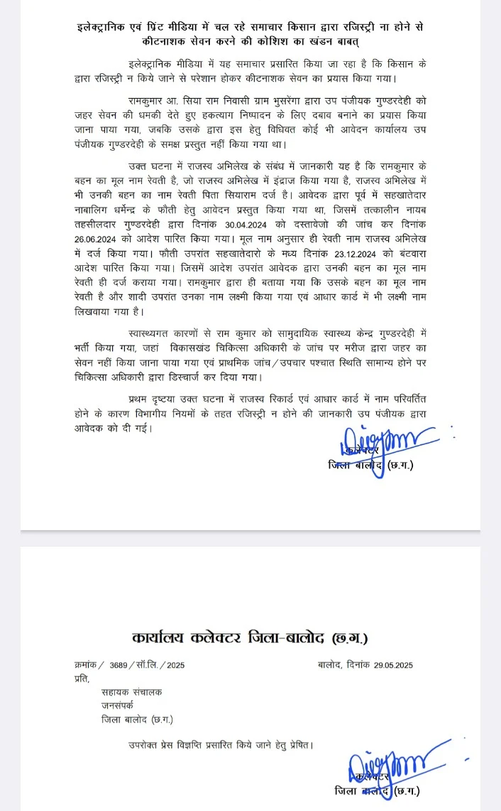 बालोद, 29 मई 2025 बालोद जिले में आज विभिन्न माध्यमों से यह खबर प्रसारित की जा रही थी, कि एक किसान ने रजिस्ट्री न किये जाने से परेशान होकर कीटनाशक सेवन का प्रयास किया, उक्त खबर पूरी तरह भ्रामक निकली। कलेक्टर श्रीमती दिव्या उमेश मिश्रा ने उक्त खबर को संज्ञान में लेते हुए जांच कराई, जिसके पश्चात यह जानकारी प्राप्त हुई कि, रामकुमार आ. सिया राम निवासी ग्राम भुसरेंगा द्वारा उप पंजीयक गुण्डरदेही को जहर सेवन की धमकी देते हुए हकत्याग निष्पादन के लिए दबाव बनाने का प्रयास किया जाना पाया गया, जबकि उसके द्वारा इस हेतु विधिवत कोई भी आवेदन कार्यालय उप पंजीयक गुण्डरदेही के समक्ष प्रस्तुत नहीं किया गया था।