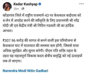 - मंत्री केदार कश्यप ने जताया प्रधानमंत्री मोदी व मंत्री गडकरी का आभार