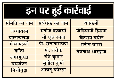 एसीबी के अतिरिक्त पुलिस अधीक्षक विगत तीन दिनों से सुकमा में डेरा जमाये हुए थे। इस मामले में संलिप्त सभी प्रबध्ंाकों को तलब किया गया था। इन प्रबंधक एव वन कर्मियों के खिलाफ अपराध क्रमांक 26/2025, धारा 409,120 बी के तहत 8 अपै्रल 2025 को अपराध दर्ज किय गया था। मामले की जांच रिपोर्ट के आधार पर 7 समिति प्रबंधक 4 वनकर्मियों को गिरफ्तार कर जेल भेज दिया गया है।