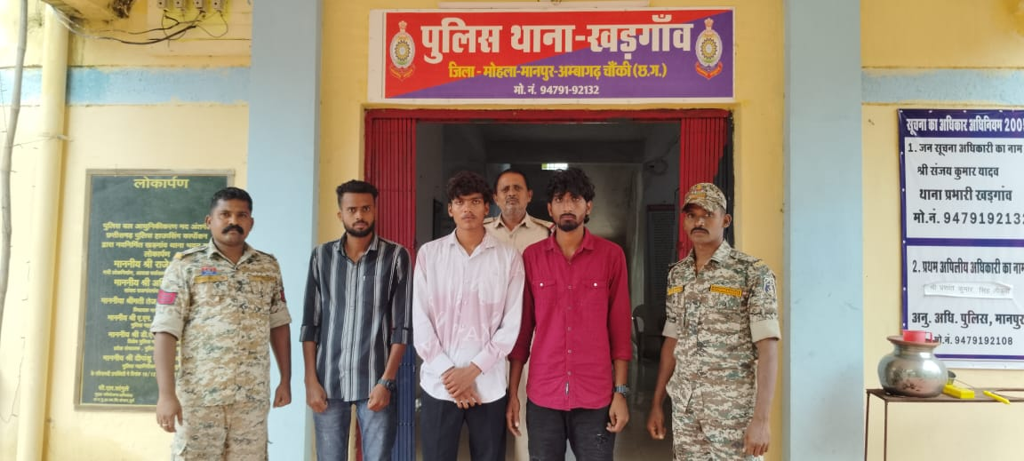 पुलिस अधीक्षक महोदय मोहला मानपुर अं० चौकी वाय पी सिंह (भा पुसे) के निर्देशन में व अतिरिक्त पुलिस अधीक्षक महोदय जिला मोहला मानपुर अं०चौकी डी.सी. पटेल, पुलिस अनुविभागीय अधिकारी प्रशांत कुमार सिंह पैकरा के मार्गदर्शन पर थाना प्रभारी संजय कुमार यादव थाना खड़गांव के निर्देशन में खड़गांव पुलिस द्वारा मामले का खुलासा करते हुये आरोपींगणों को किया गिरफ्तार।