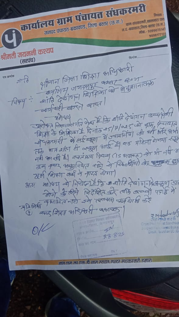 बकावंड विकासखंड बकावंड की ग्राम पंचायत संधकरमरी के शासकीय हाई स्कूल की एक शिक्षिका बीते करीब दो माह से नदारद है। इस शिक्षिका ने ज्वाइनिंग करके लौटने के बाद दोबारा स्कूल में कदम नहीं रखा है। शिक्षिका की इस गैर जिम्मेदारी पूर्ण हरकत से पंचायत प्रतिनिधियों और ग्रामीणों में आक्रोश देखा जा रहा है। संधकरमरी की सरपंच जयमनी कश्यप ने बस्तर जिला शिक्षा अधिकारी बीआर बघेल को आवेदन देकर शिक्षिका शांति देवांगन के खिलाफ कड़ी कार्रवाई करने और उनकी जगह संधकरमरी हाई स्कूल में जिम्मेदार शिक्षक या शिक्षिका की नियुक्ति करने की मांग की है।