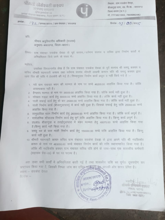 बकावंड विकासखंड बकावंड की ग्राम पंचायत रायकेरा देवड़ा में सरकारी धन की जमकर लूट की जा रही है। बिना काम कराए ही पूर्व और मौजूदा सरपंच एवं सचिव लाखों रुपए गटक चुके हैं।. मामले की शिकायत क्षेत्र की जनपद सदस्य खेमेश्वरी कश्यप ने एसडीएम बकावंड से की है।