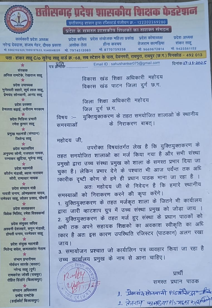 *छत्तीसगढ़ प्रदेश शासकीय शिक्षक फेडरेशन ने समायोजन शाला के प्रभावित प्रधान पाठक बी.ई.ओ. पाटन- डी. के. देवांगन से मिले।* पाटन//- विकासखंड-पाटन के समायोजन शाला के प्रधान पाठको ने आज विकासखंड शिक्षा अधिकारी- डी. के. देवाँगन जी से छ.ग. प्रदेश शासकीय शिक्षक फेडरेशन के प्रांतीय व जिला टीम के सदस्यों ने सौजन्य मुलाकात कर ज्ञापन सौंपकर चर्चा किया। जिसमे मर्ज शाला मे आ रहे विभिन्न परेशानियों के बारे मे विस्तृत चर्चा किया गया, विकासखंड शिक्षा अधिकारी-देवांगन ने मर्ज शाला के दोनो संस्था प्रमुखो की बहुत जल्द एक बैठक आहुत करने का अश्वासन दिया गया।विकासखंड शिक्षा अधिकारी- पाटन से मुलाकात कर समस्याओं के बारे में छ. ग. प्रदेश शासकीय शिक्षक फेडरेशन के प्रांतीय संरक्षक- रेखराज साहू, प्रांतीय कोषाध्यक्ष- तेजराम कामडियाँ, प्रांतीय उपाध्यक्ष- प्रेमचंद सोनवानी, जिलाध्यक्ष- अनिल ठाकुर, पुष्कर यादव, हेमंत कुर्रे, अजय सेन, परस राम ठाकुर, पंकज चंद्राकर, श्रीमती केमेश्वरी देशमुख, श्रीमती रचना वर्मा, श्रीमती मधु वर्मा, श्रीमती सीमा वर्मा, श्रीमती सीता वैष्णव,श्रीमती लिखेश्वरी चन्द्राकर प्रमुख रुप से उपस्थित थे।उपरोक्त जानकारी मीडिया में छत्तीसगढ़ प्रदेश शासकीय शिक्षक फेडरेशन के दुर्ग जिला अध्यक्ष अनिल ठाकुर ने दिया है।