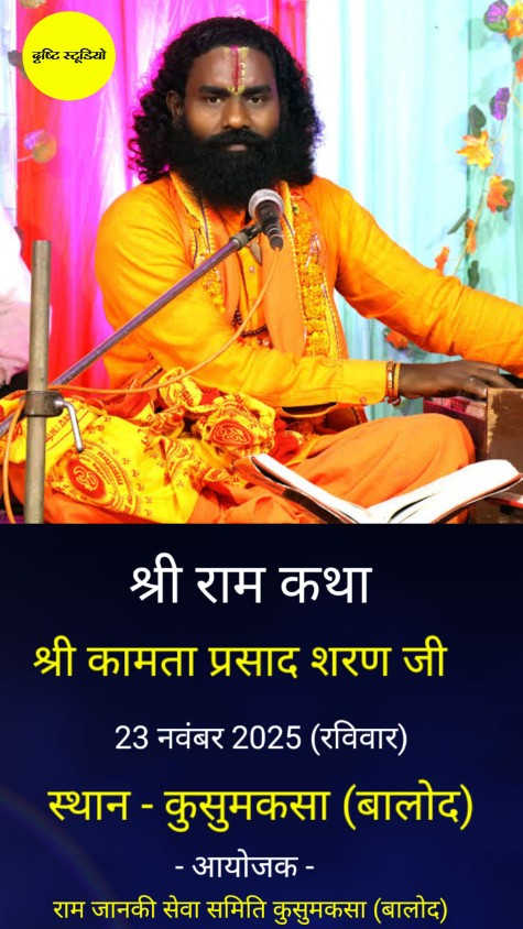 ग्राम कुसुमकसा की अग्रणी सामाजिक संस्था “रामजानकी सेवा समिति” के द्वारा छत्तीसगढ़ के सुप्रसिद्ध कथा वाचक एवं भजन सम्राट “श्री कामता प्रसाद शरण जी” के जय गुरुदेव संकीर्तन मानस परिवार,कूड़े दादर का कार्यक्रम “श्री राम कथा एवं भजन संध्या” का भक्तिमय आयोजन रविवार रात्रि 8:00 बजे से कोठारी मैदान, कुसुमकसा,जिला बालोद में आयोजित है। ज्ञात हो कि श्री कामता प्रसाद शरण जी हिंदी एवं छत्तीसगढ़ी के सुप्रसिद्ध कथा वाचक है,जिनके सोशल मीडिया चैनल में लाखों की संख्या में प्रशंसक है जो इनके कथा का आनंद लेते हैं ।