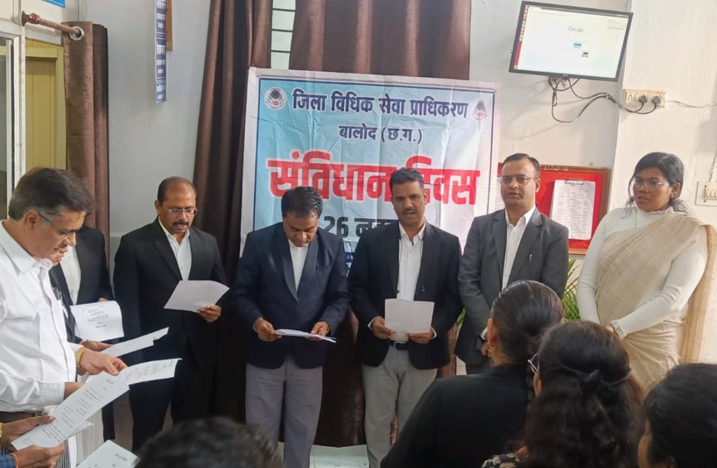 बालोद, 26 नवंबर 2025 राष्ट्रीय विधिक सेवा प्राधिकरण नई दिल्ली द्वारा संचालित योजनाओं के क्रियान्वयन एवं प्रचार-प्रसार हेतु तथा छत्तीसगढ़ राज्य विधिक सेवा प्राधिकरण द्वारा जारी स्टेट प्लॉन आफ एक्शन के अनुसार जिला न्यायालय बालोद में आज 26 नवंबर को संविधान की उद्देशिका का वाचन कर संविधान दिवस का आयोजन प्रधान जिला न्यायाधीश एवं जिला विधिक सेवा प्राधिकरण बालोद के अध्यक्ष एस.एल. नवरत्न की उपस्थिति में किया गया।