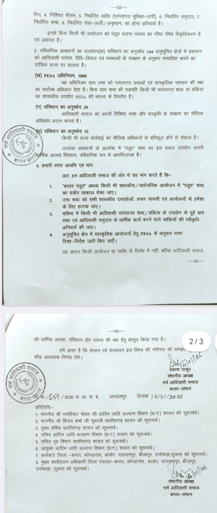 जगदलपुर सर्व आदिवासी समाज ने अनुसूचित क्षेत्र बस्तर में प्रस्तावित एवं आयोजित कार्यक्रमों में “पंडूम” शब्द के प्रयोग पर आपत्ति दर्ज कराते हुए उक्त शब्द को तत्काल हटाने एवं आदिवासी धार्मिक परंपराओं की संवैधानिक रक्षा सुनिश्चित करने की मांग की है। सर्व आदिवासी समाज के बस्तर संभाग अध्यक्ष प्रकाश ठाकुर ने इस संबंध में राजयपाल, मुख्यमंत्री, आदिम जाति कल्याण मंत्री एवं शीर्ष अधिकारियों को पत्र प्रेषित किया है।