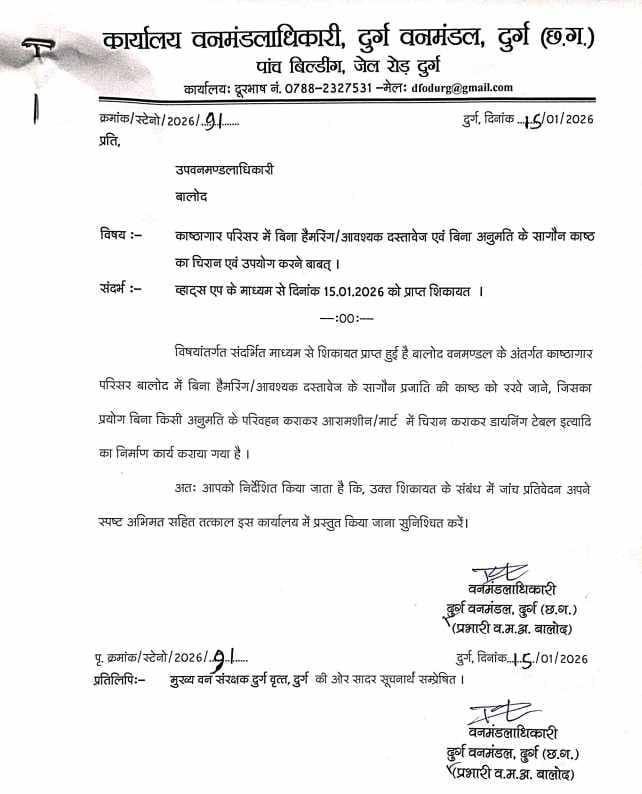 बालोद जिले में वन विभाग की कार्यप्रणाली एक बार फिर सवालों के घेरे में आ गई है। जंगलों की सुरक्षा और संरक्षण की जिम्मेदारी संभालने वाले अधिकारियों पर ही सागौन की अवैध कटाई और सरकारी लकड़ी के निजी उपयोग के गंभीर आरोप लगे हैं। आरोप है कि संरक्षित वन क्षेत्र से काटी गई सागौन लकड़ी से महंगे फर्नीचर तैयार कराए गए।प्राप्त जानकारी के अनुसार, अवैध रूप से काटी गई सागौन लकड़ी को पहले वन विभाग के काष्ठागार में रखा गया। इसके बाद उसी लकड़ी को आरा-मिल भेजकर चिरान कराया गया और कारपेंटर के माध्यम से टी-टेबल, ड्रेसिंग टेबल सहित अन्य फर्नीचर तैयार किए गए।सूत्रों के मुताबिक, इस पूरे मामले में तत्कालीन वनमंडल अधिकारी अभिषेक अग्रवाल के निर्देश पर कार्रवाई किए जाने की बात सामने आ रही है।