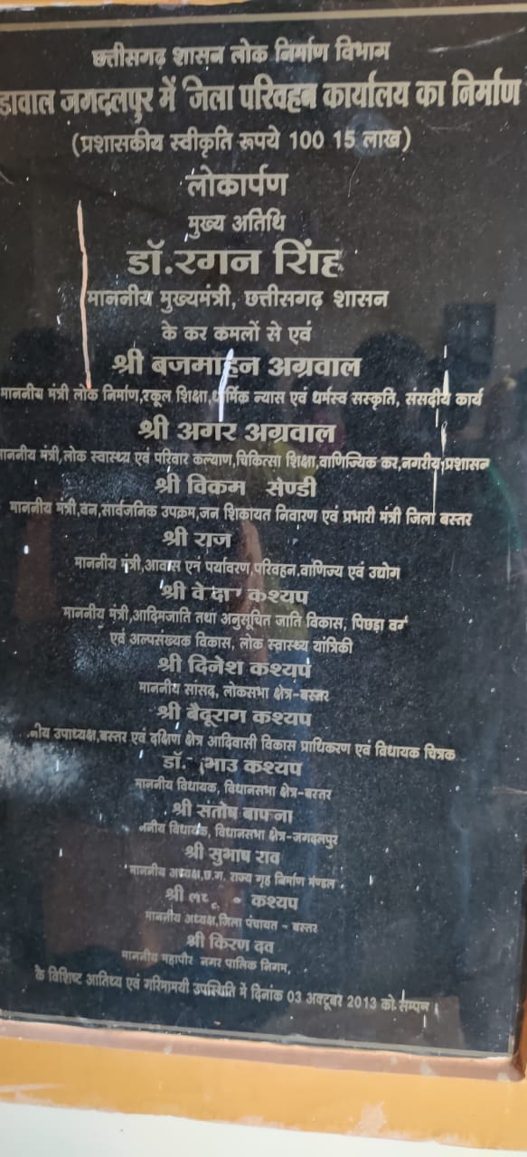 प्रदेश की कांग्रेस सरकार के जिम्मेदार जनप्रतिनिधियों/ स्थानीय कांग्रेस के जनप्रतिनिधियों की चुप्पी से प्रतीत होता है कि उनकी हिस्सेदारी अवैध वसूली में है और आरटीओ विभाग को भ्रष्टाचार करने का पूरा संरक्षण प्राप्त है आरटीओ विभाग को मोटी रकम लेने की खुली छूट देकर भ्रष्टाचार की सारी सीमाएं कांग्रेस के नेताओं को खुश करने के लिए भ्रष्टाचार को पूरी चरम पर पहुंचा दिया है भारतीय जनता पार्टी नगर मंडल और नगरनार मंडल यह मांग करता है कि लोकल में जो परिवहन करता है जो खदानों से रेत गिट्टी मिट्टी का परिवहन कर रहे हैं जहां पर किसी प्रकार का तोल की व्यवस्था नहीं है और हर वस्तु का अलग-अलग माफ है इन्हीं ओवरलोड के नाम पर परेशान ना किया जाए आरटीओ कार्यालय परिसर के लोकार्पण 3 फरवरी 2013 में लगी शिलालेख पट्टी का जिसमें तत्कालीन प्रदेश के मुखिया डॉ रमन सिंह तत्कालीन परिवहन मंत्री राजेश मुर त,अमर अग्रवाल, बृजमोहन अग्रवाल, केदार कश्यप ,विक्रम उसेंडी, दिनेश कश्यप ,संतोष बाफना, श्रीनिवास राव मद्दी,सुभाउ कश्यप, बैदूराम कश्यप ,किरण देव एवं क्षेत्र के जनप्रतिनिधियों के नामों में पूर्वाग्रहों से ग्रसित होकर कुटिल मानसिकता के विरोधियों द्वारा अभद्र रूप से इनके नामों में छेड़छाड़ की गई है जो अत्यंत निंदनीय एवं अपमानजनक है जिसका सुधार सात दिवस के अंतर्गत आपके द्वारा सुधार किया जाए अन्यथा भारतीय जनता पार्टी के कार्यकर्ता इसी वाले को पूर्ण पूर्व की भांति शिलालेख में सुधार करेंगे।