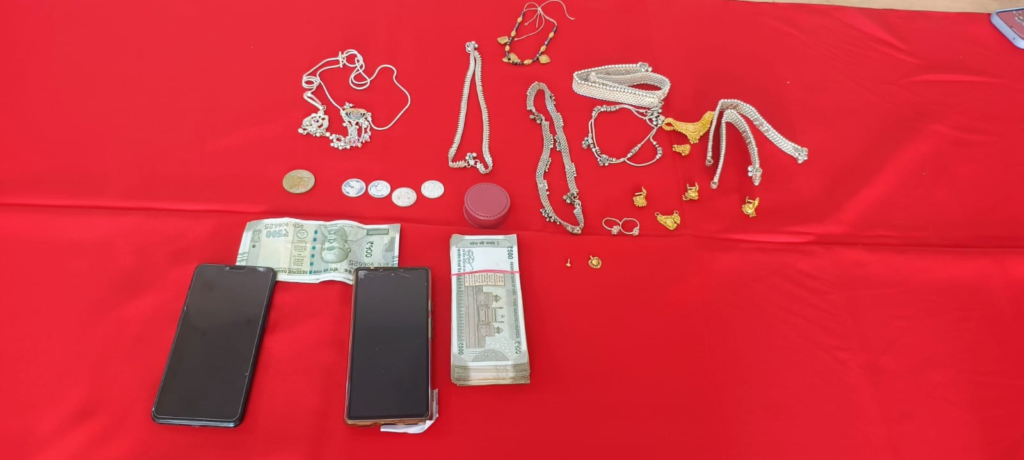 सोने का लॉकेट, 02 जोड़ी सोने का झुमका, 01 नग सोने का मंगलसूत्र, 01 नग सोने का छोटा हार, पांच जोड़ी चांदी का पायल, 05 नग चांदी का सिक्का, मोबाईल फोन कुल जुमला लगभग 2,21,000 रूपये एवं 28,500 रूपये नगदी रकम को आरोपियों के कब्जे से पुलिस ने किया बरामद।